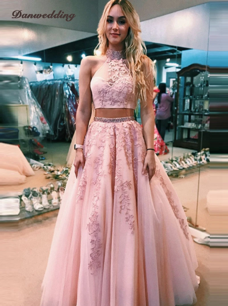 Элегантный комплект из двух предметов, вечерние платья с лямкой на шее, длиной до пола, кружевные женские вечерние платья с открытой спиной для девушек