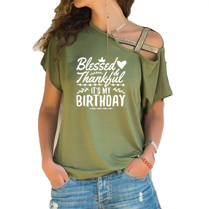 Рады ответить на ваши вопросы и благословил ее My Birthday Ультрамодная рубашка слоган Женская мода гранж подарок на день рождения Нерегулярные Косой, накрест, облегающий, футболки, топы