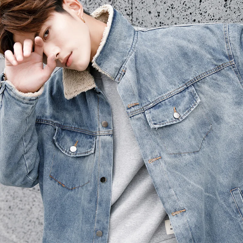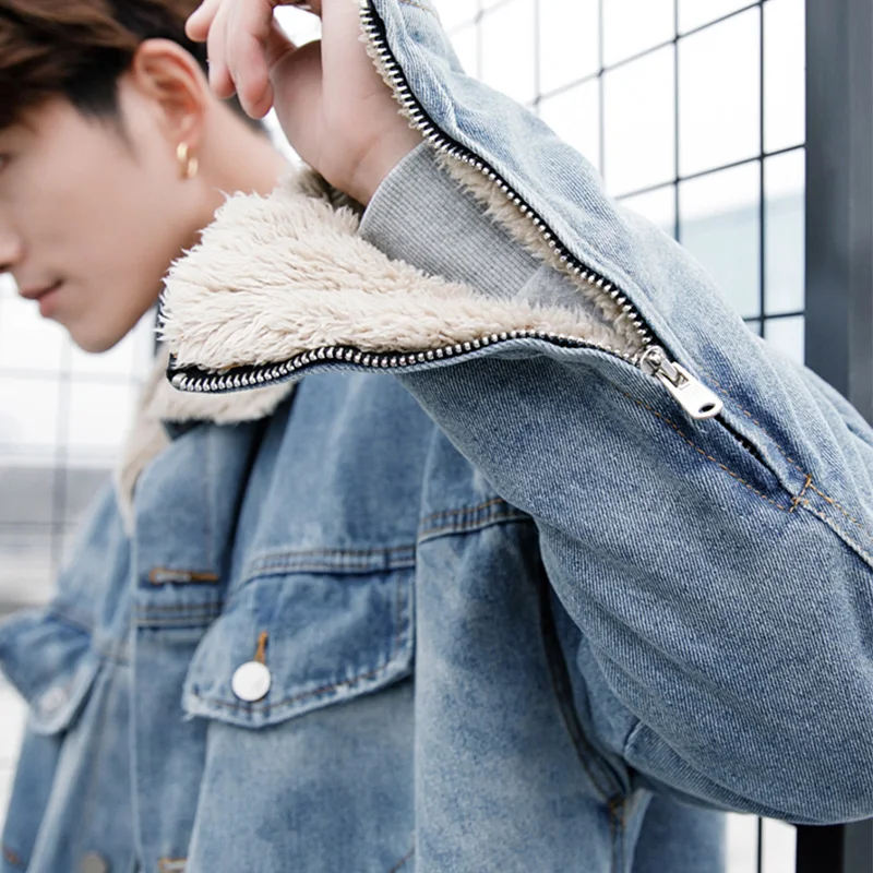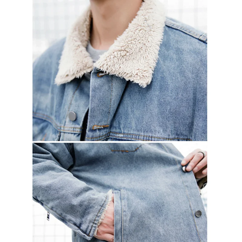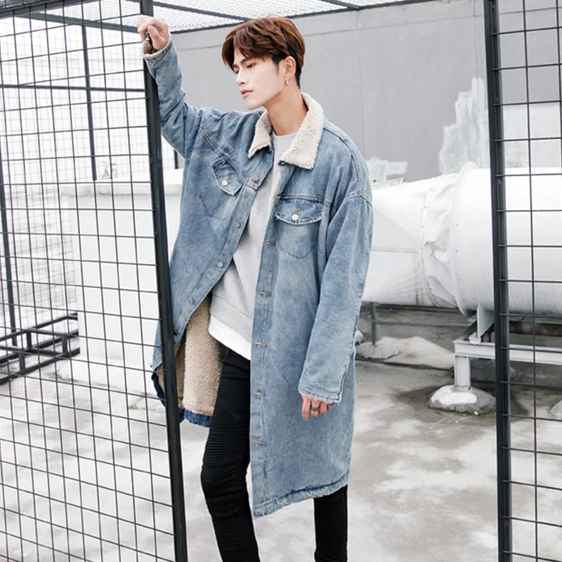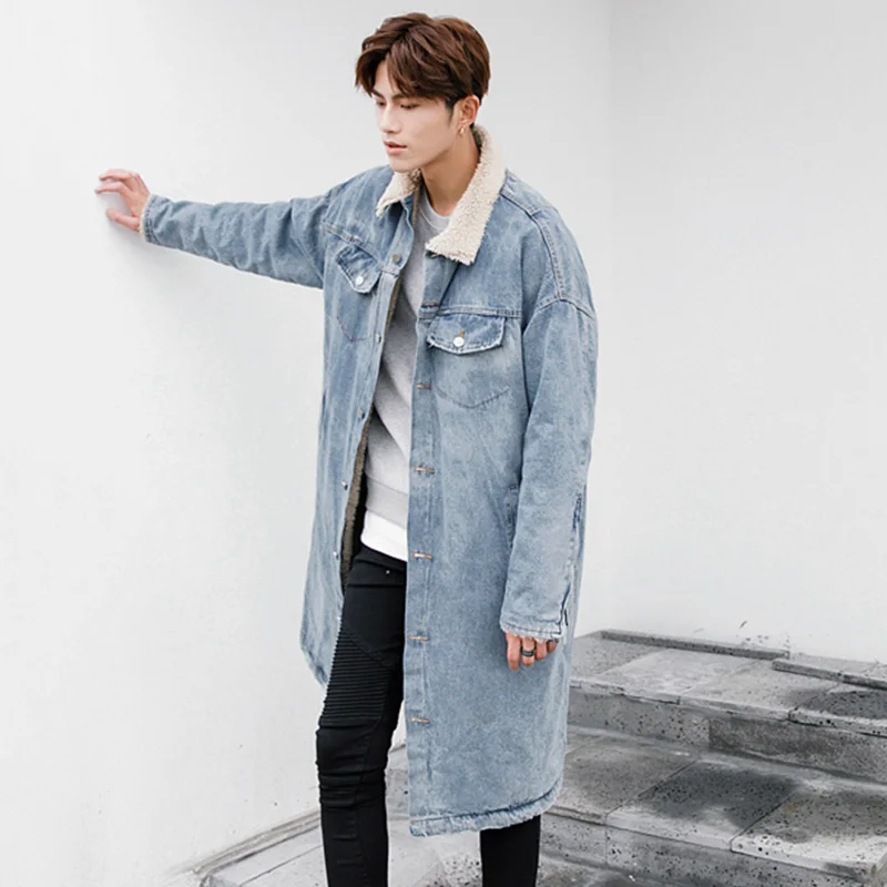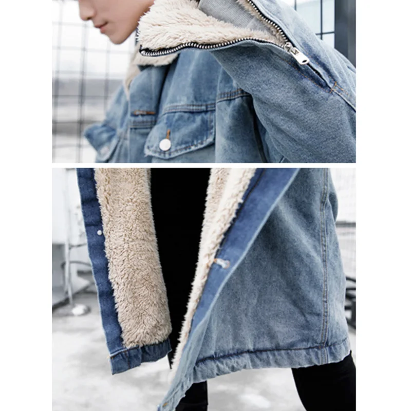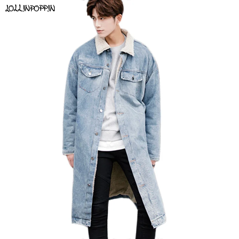 Мужская длинная джинсовая куртка на флисовой подкладке, толстая синяя джинсовая куртка на молнии с отложным воротником, свободная джинсовая куртка в стиле ретро на зиму