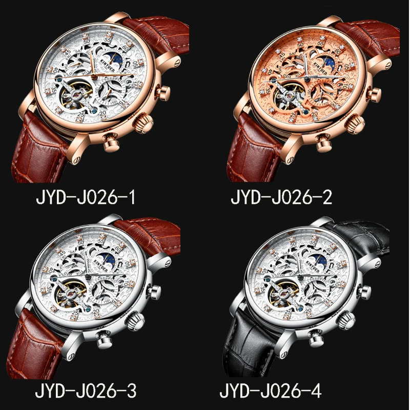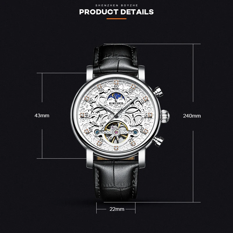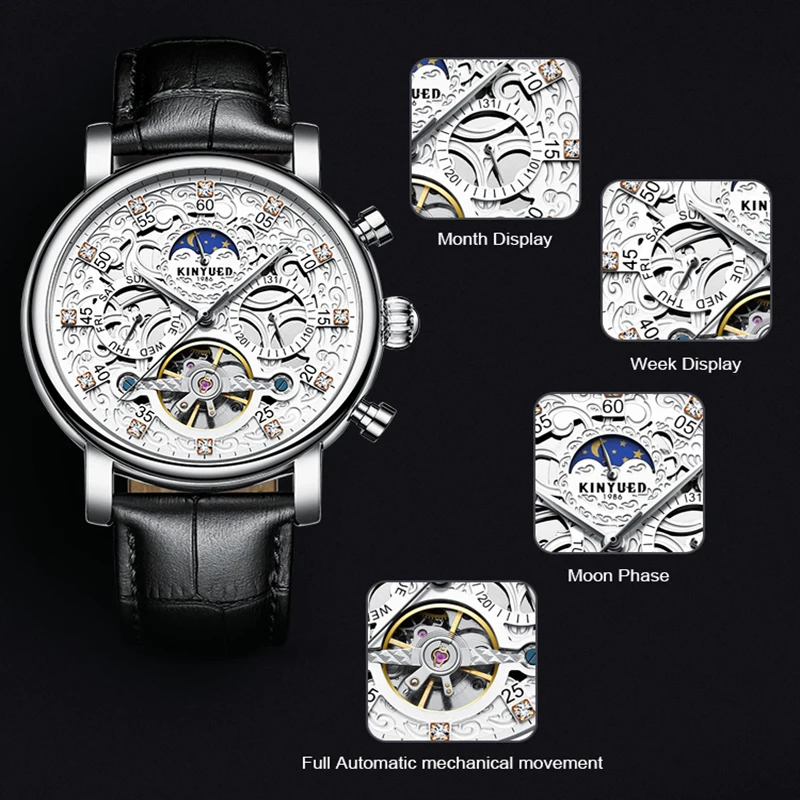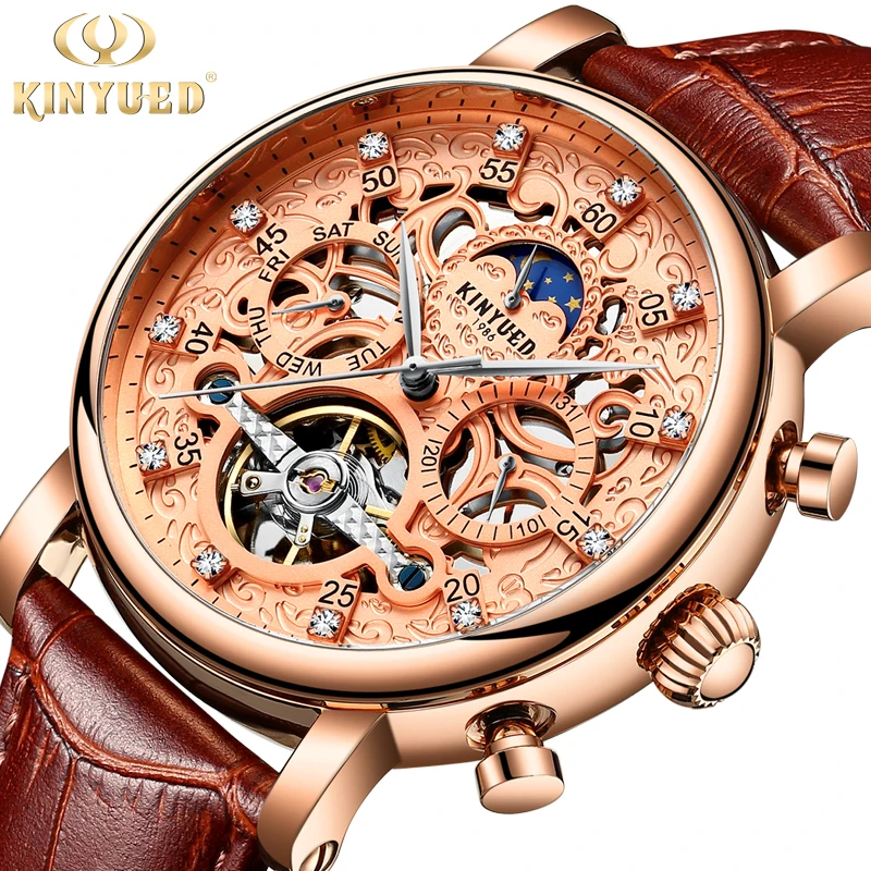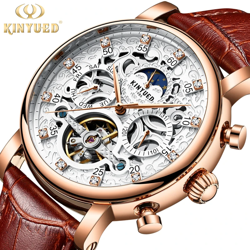 KINYUED автоматические, календарь, фаза Луны, отображение недели, водонепроницаемые, модные высококлассные мужские механические часы с кожаным ремешком