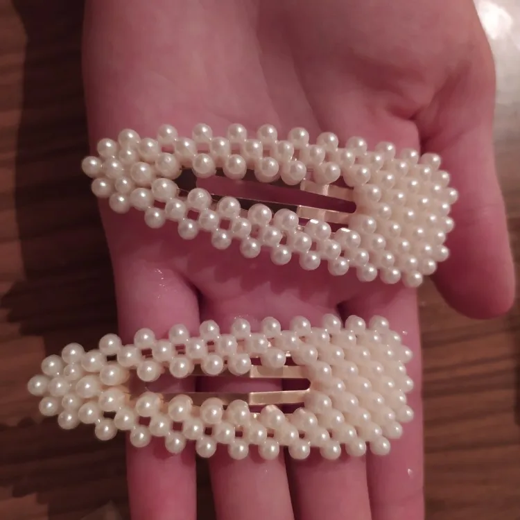 Ужасное качество. Бусины оказались склееными, выглядит как кусок пластика. Не белые, а с желым оттенком. Из-за того, что пластик просто вставлен на заколку, постоянно цепляет и рвёт волосы.