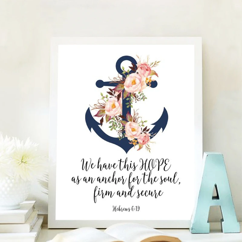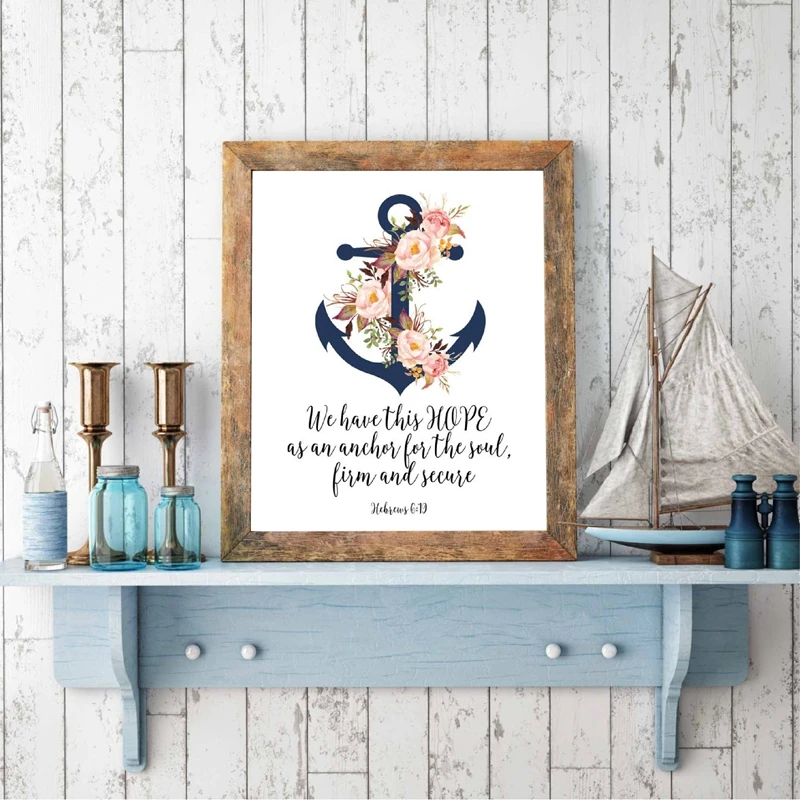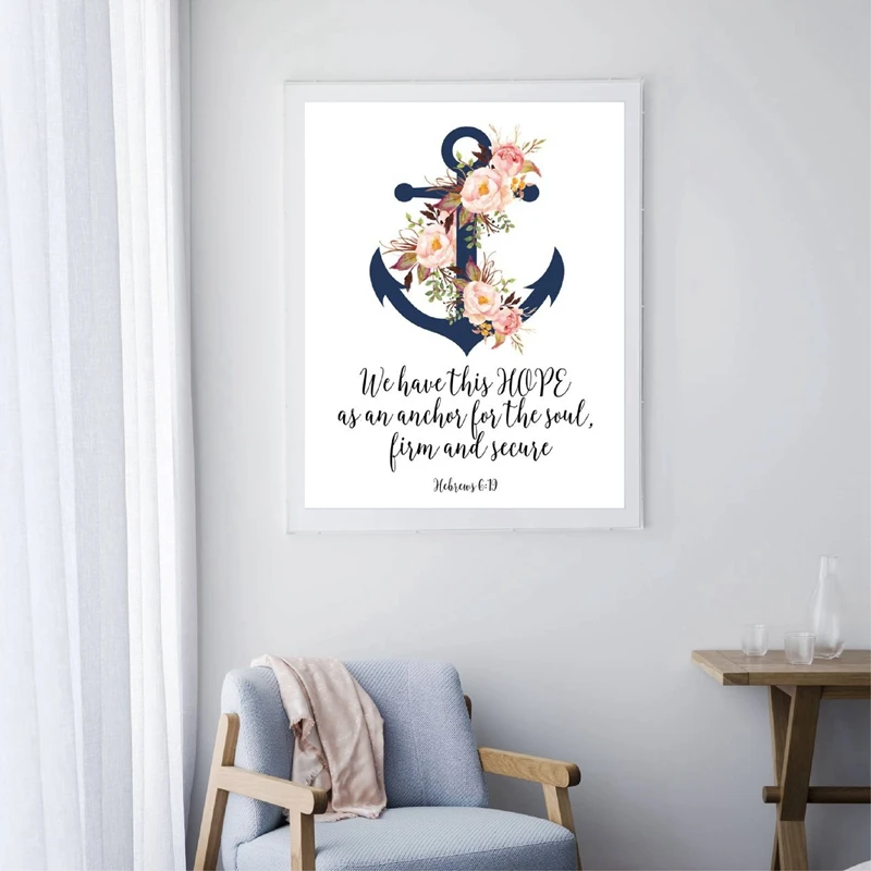 Библия, тексты евреев 6:19, с принтом с цитатой, Писание, настенное искусство, холст, живопись, акварель, якорь, цветок, религиозный плакат, домашний декор