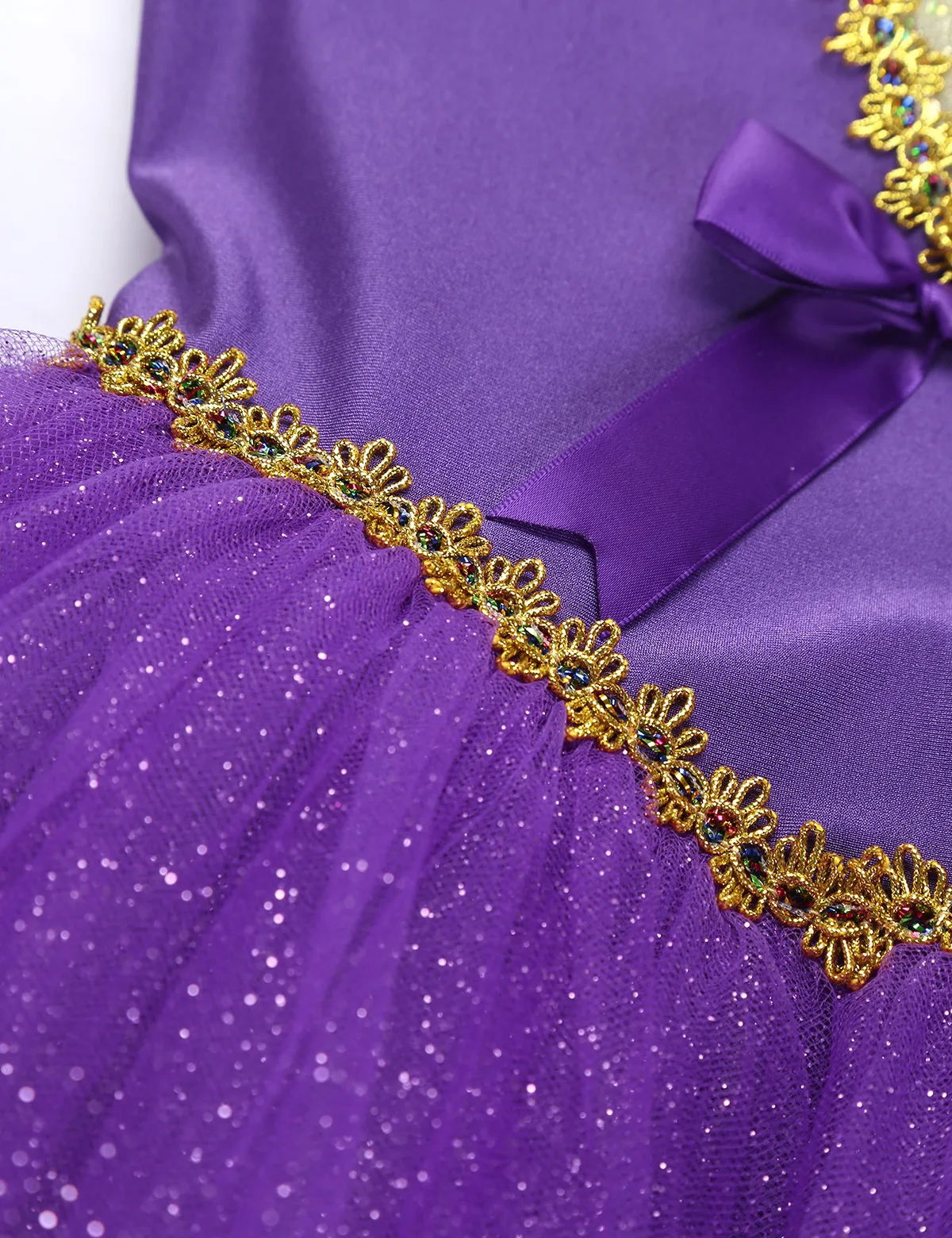Золотистая плетеная отделка спереди и линии талии. Трехслойное Сетчатое платье с блестками на талии. Подходящая накидка и пара рукавов из сетки.