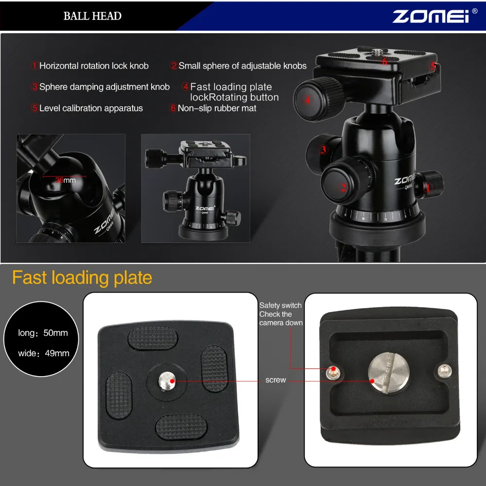 3: утопленный крючок с центральной колонной на штативах ZOMEI: пружинный утопленный крючок, расположенный в нижней части центральной колонны, позволяет подвешивать дополнительный вес от центра тяжести штатива для повышения стабильности. Отдельный замок головки и сковороды: Индивидуальное натяжение головки и ручка замка, а также фиксатор сковороды помогут сделать правильную регулировку.