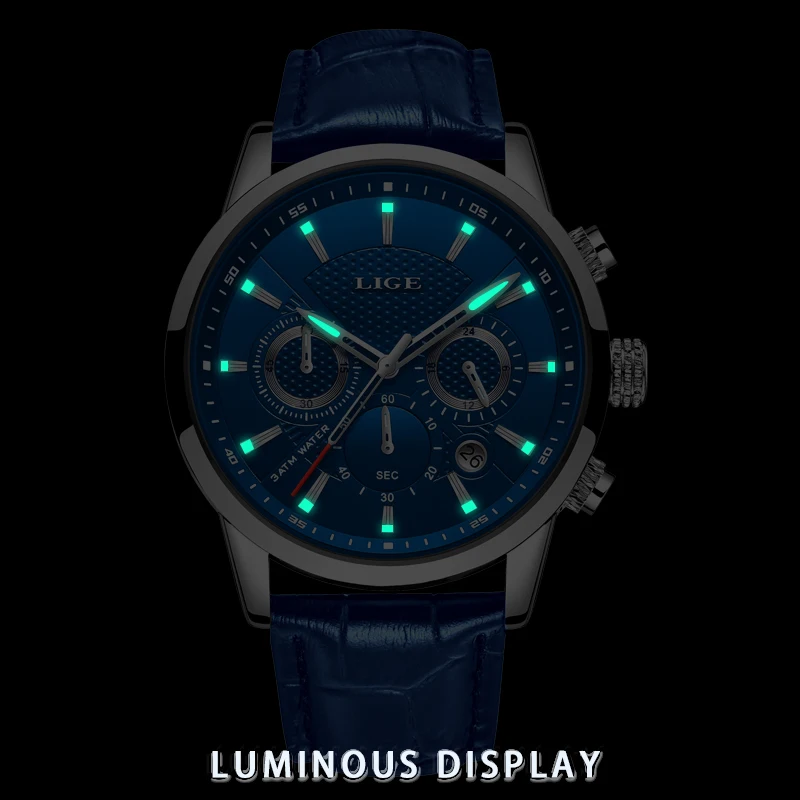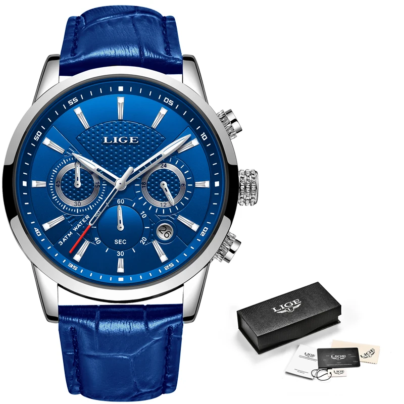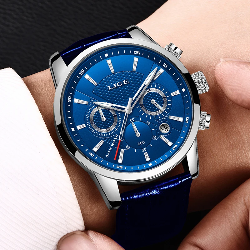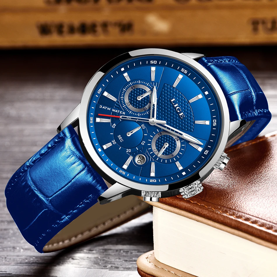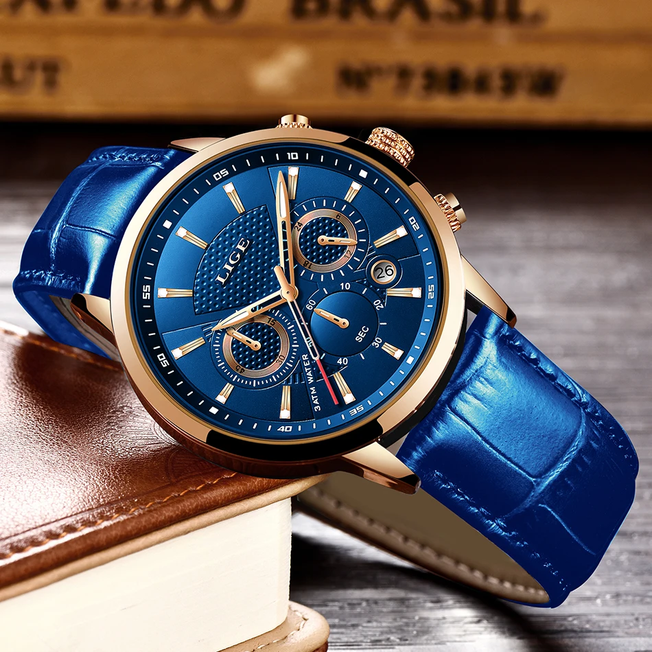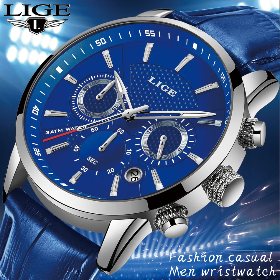 Часы наручные LIGE Мужские кварцевые, модные брендовые Роскошные водонепроницаемые спортивные с хронографом и кожаным ремешком, синие