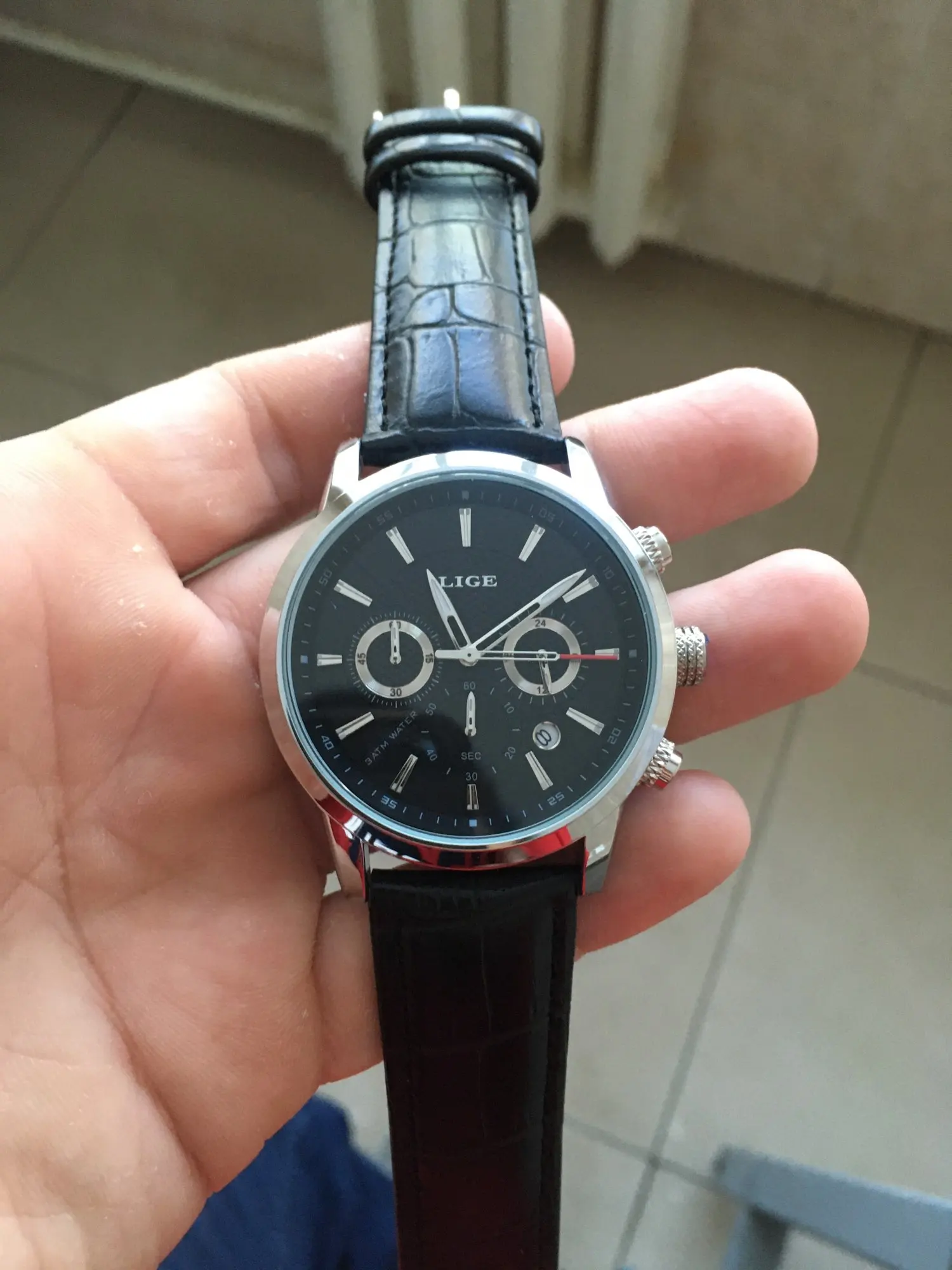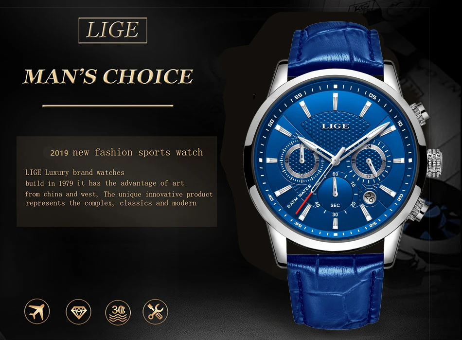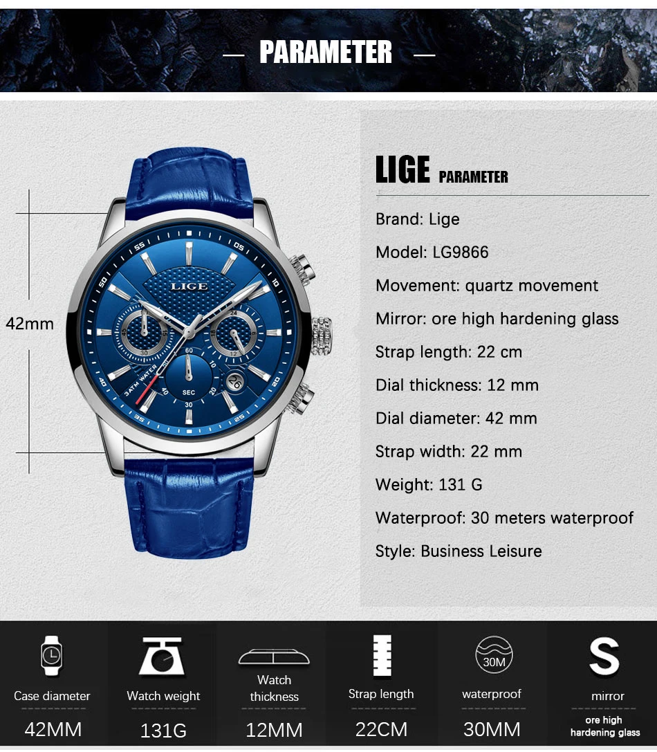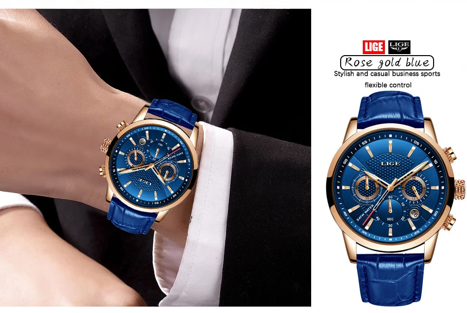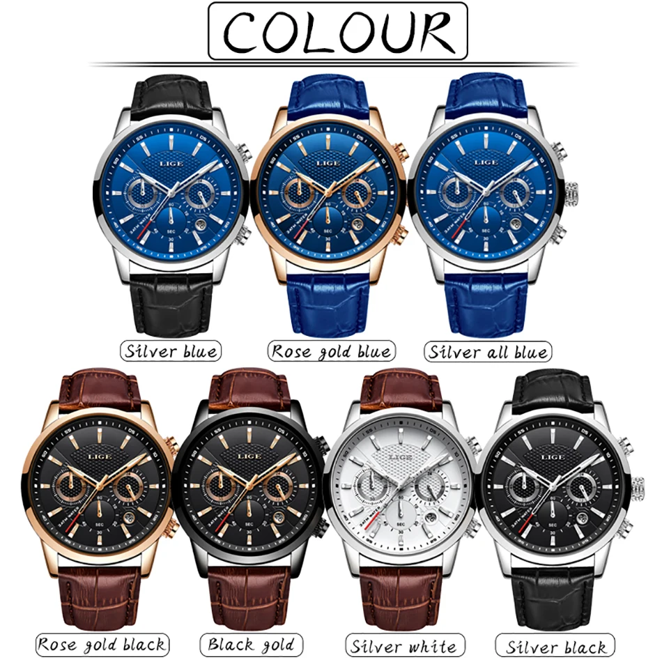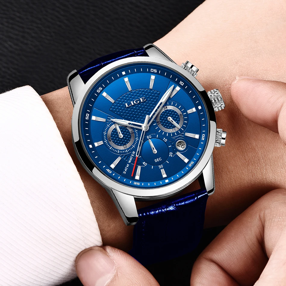 Часы наручные LIGE Мужские кварцевые, модные брендовые Роскошные водонепроницаемые спортивные с хронографом и кожаным ремешком, синие