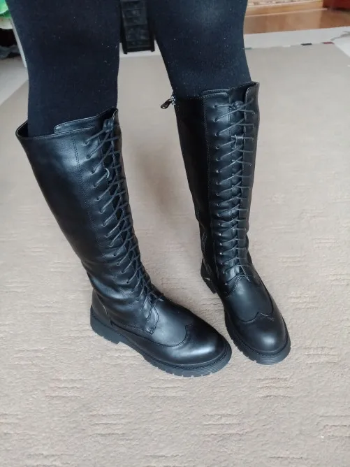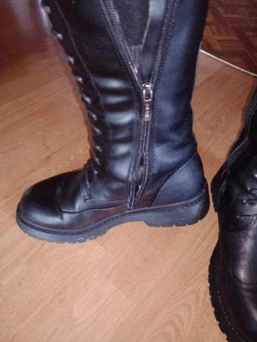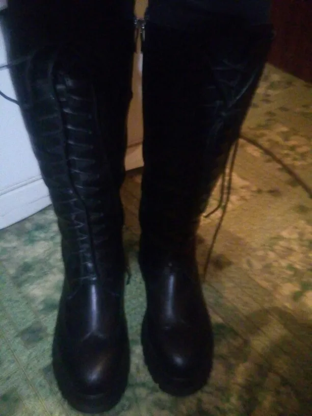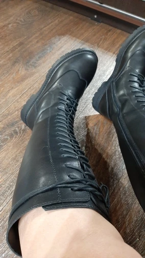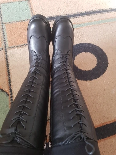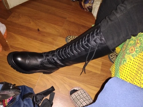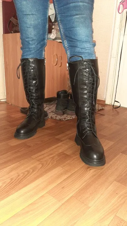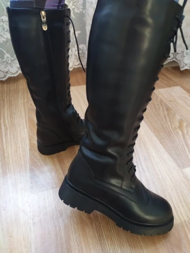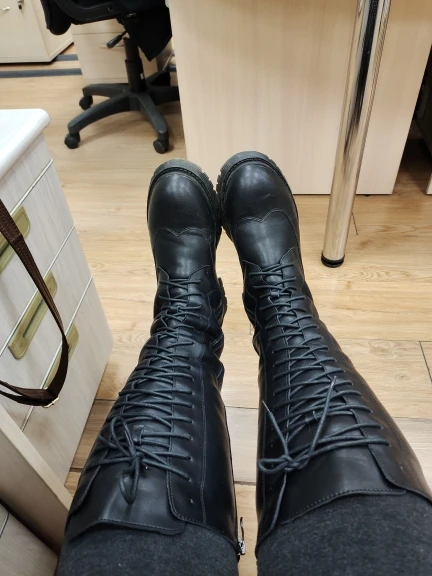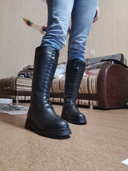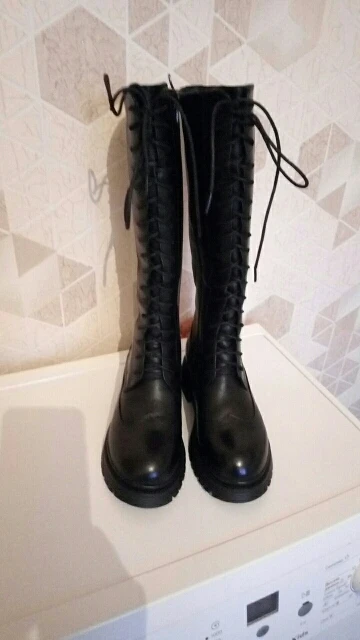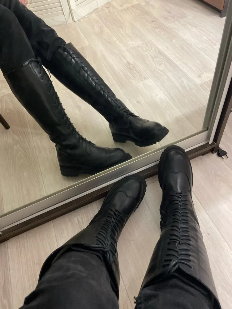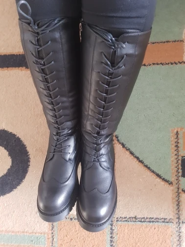 Выглядят хорошо, качественно. Кожа натуральная. На 39 размер взяла 11 и ошиблась . Они очень большие и широкие в голени. Надеюсь шнуровкой спереди смогу отрегулировать полнот. Есть только один минус - сапоги очень тяжелые по весу.