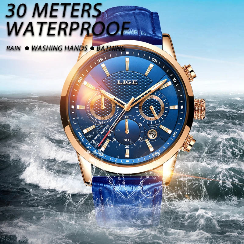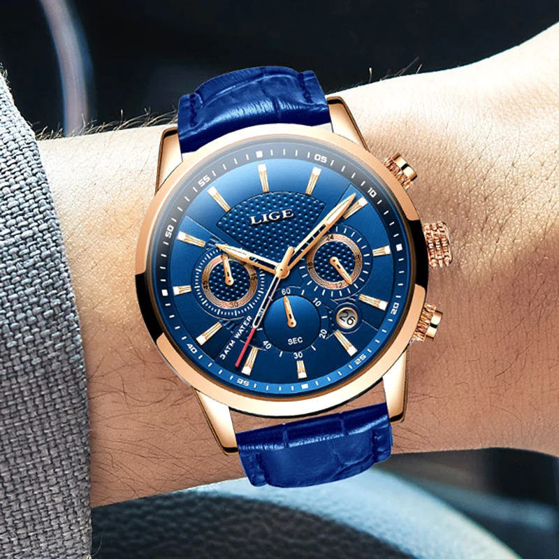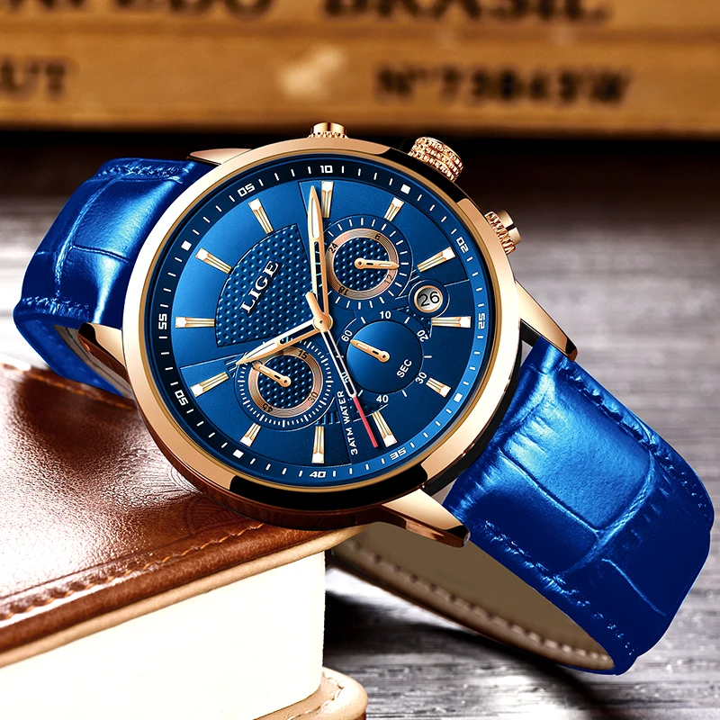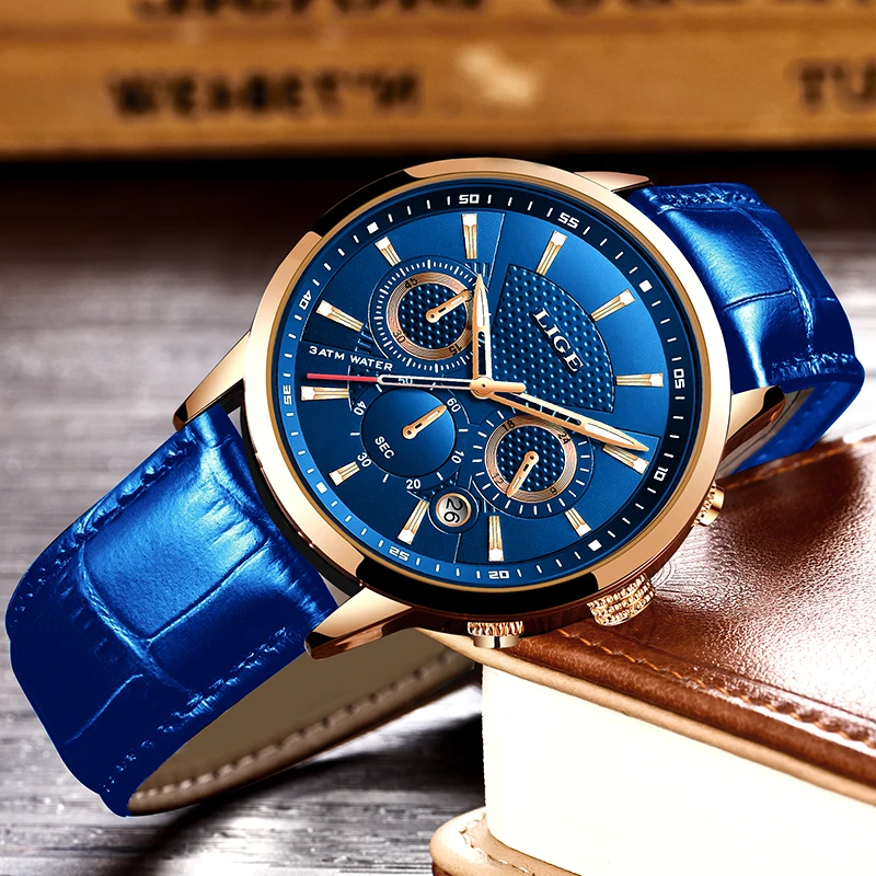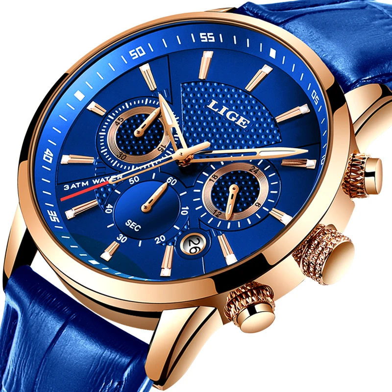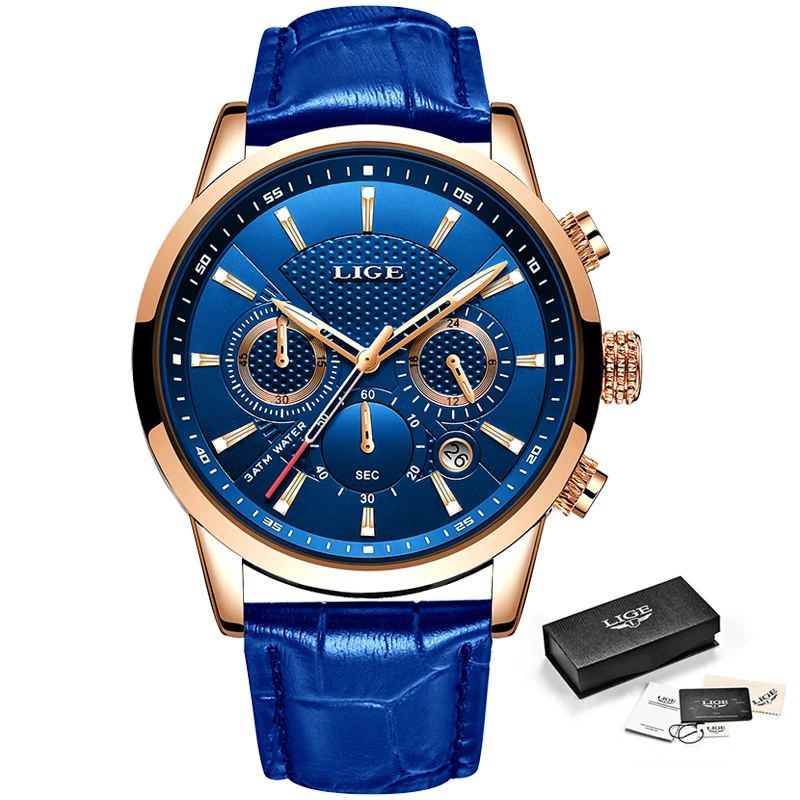 LIGE новые мужские часы лучший бренд синий кожаный Хронограф Водонепроницаемый Спорт Автоматическая Дата кварцевые часы для мужчин s Relogio Masculino