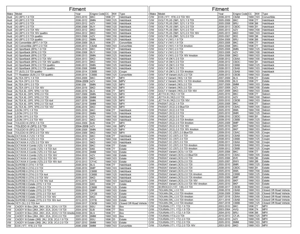 Применимость:Для Audi A3 (8P1) 1,9 TDI 2003-2010 Enigne: BKC 1896ccm 77KW хэтчбекДля Audi A3 (8P1) 2,0 TDI 2006-2012 Enigne: BMN 1968ccm 125 кВт хэтчбекДля Audi A3 (8P1) 2,0 TDI 2003-2012 Enigne: AZV 1968ccm 100 кВт хэтчбекДля Audi A3 (8P1) 2,0 TDI 2006-2008 Enigne: если вы купили 1968ccm 120KW хэтчбекДля Audi A3 (8P1) 2,0 TDI 16 V 2003-2012 Enigne: BKD 1968ccm 103KW хэтчбекДля Audi A3 (8P1) 2,0 TDI 16 V quattro 2004-2012 Enigne: BKD 1968ccm 103KW хэтчбекДля Audi A3 (8P1) 2,0 TDI quattro 2003-2008 Enigne: AZV 1968ccm 100KW хэтчбекДля Audi A3 (8P1) 2,0 TDI quattro 2006-2012 Enigne: BMN 1968ccm 125 кВт хэтчбекДля Audi A3 кабриолет (8P7) 1,9 TDI 2008-2009 Enigne: BLS 1896ccm 77KW трансформерДля Audi A3 трансформер (8P7) 2,0 TDI 2008-2013 Enigne: CBAB 1968ccm 103KW трансформерДля Audi A3 Sportback (8 PA) 1,9 TDI 2004-2010 Enigne: BKC 1896ccm 77KW хэтчбекДля Audi A3 Sportback (8 PA) 2,0 TDI 2006-2008 Enigne: Купить 1968ccm 120 кВт хэтчбекДля Audi A3 Sportback (8 PA) 2,0 TDI 2006-2013 Enigne: BMN 1968ccm 125 кВт хэтчбекДля Audi A3 Sportback (8 PA) 2,0 TDI 16 V 2004-2013 Enigne: BKD 1968ccm 103KW хэтчбекДля Audi A3 Sportback (8 PA) 2,0 TDI 16 V quattro 2005-2013 Enigne: BKD 1968ccm 103KW хэтчбекДля Audi A3 Sportback (8 PA) 2,0 TDI quattro 2006-2013 Enigne: BMN 1968ccm 125 кВт хэтчбекДля Audi A3 Sportback (8 PA) 2,0 TDI quattro 2006-2008 Enigne: BMM 1968ccm 103KW хэтчбекДля Audi TT (8J3) 2,0 TDI quattro 2008-2014 Enigne: CBBB 1968ccm 125 кВт купеДля Audi TT Roadster (8J9) 2,0 TDI quattro 2008-2014 Enigne: CBBB 1968ccm 125KW с откидным верхомДля Seat ALTEA (5P1) 1,9 TDI 2004-2009 Enigne: BKC 1896ccm 77 KW MPVДля Seat ALTEA (5P1) 2,0 TDI 2004-2009 Enigne: AZV 1968ccm 100 кВт MPVДля Seat ALTEA (5P1) 2,0 TDI 2006-209 Enigne: BMN 1968ccm 125 кВт MPVДля Seat ALTEA (5P1) 2,0 TDI 16 V 2004-2019 Enigne: BKD 1968ccm 103KW MPV Субару OutbackДля Seat ALTEA XL (5P5, 5P8) 1,9 TDI 2006-2019 Enigne: BLS 1896ccm 77KW MPV Субару OutbackДля Seat ALTEA XL (5P5, 5P8) 2,0 TDI 2007-2009 Enigne: BMN 1968ccm 125KW MPV Субару OutbackДля Seat ALTEA XL (5P5, 5P8) 2,0 TDI 2006-2009 Enigne: BMM 1968ccm 103KW MPVДля Seat ALTEA XL (5P5, 5P8) 2,0 TDI 4x4 2007-2019 Enigne: BMN 1968ccm 125 кВт MPVДля Seat ALTEA XL (5P5, 5P8) 2,0 TDI 4x4 2007-2019 Enigne: BMM 1968ccm 103KW MPVДля Seat ALTEA XL (5P5, 5P8) 2,0 TDI 16 V 2006-2019 Enigne: BKD 1968ccm 103KW MPVДля Seat LEON (1P1) 1,9 TDI 2005-2010 Enigne: BKC 1896ccm 77 кВт хэтчбекДля Seat LEON (1P1) 2,0 TDI 2006-2012 Enigne: BMN 1968ccm 125 кВт хэтчбекДля Seat LEON (1P1) 2,0 TDI 2005-2010 Enigne: AZV 1968ccm 100KW хэтчбекДля Seat LEON (1P1) 2,0 TDI 16 V 2005-2012 Enigne: BKD 1968ccm 103KW хэтчбекДля Seat TOLEDO III (5P2) 1,9 TDI 2004-2009 Enigne: BJB 1896ccm 77KW MPV Субару OutbackДля Seat TOLEDO III (5P2) 2,0 TDI 2004-2009 Enigne: AZV 1968ccm 100 кВт MPVДля Seat TOLEDO III (5P2) 2,0 TDI 2006-2009 Enigne: BMN 1968ccm 125 кВт MPVДля Seat TOLEDO III (5P2) 2,0 TDI 16 V 2004-2009 Enigne: BKD 1968ccm 103KW MPVДля Skoda OCTAVIA II (1Z3) 1,9 TDI 2004-2010 Enigne: BKC 1896ccm 77KW хэтчбекДля Skoda OCTAVIA II (1Z3) 2,0 TDI 2004-2010 Enigne: AZV 1968ccm 100KW хэтчбекДля Skoda OCTAVIA II (1Z3) 2,0 TDI 16 V 2004-2013 Enigne: BKD 1968ccm 103KW хэтчбекДля Skoda OCTAVIA II Combi (1Z5) 1,9 TDI 2004-2010 Enigne: BKC 1896ccm 77 KW EstateДля Skoda OCTAVIA II Combi (1Z5) 1,9 TDI 4x4 2004-2010 Enigne: BXE 1896ccm 77KW УниверсалДля Skoda OCTAVIA II Combi (1Z5) 2,0 TDI 4x4 2006-2010 Enigne: BMM 1968ccm 103KW EstateДля Skoda OCTAVIA II Combi (1Z5) 2,0 TDI 16 V 2004-2010 Enigne: AZV 1968ccm 100KW EstateДля Skoda OCTAVIA II Combi (1Z5) 2,0 TDI 16 V 2004-2013 Enigne: BKD 1968ccm 103KW EstateДля Skoda OCTAVIA II Combi (1Z5) 2,0 TDI 16 V 4x4 2010-2013 Enigne: ХФУ 1968ccm 103KW УниверсалДля Skoda SUPERB II (3T4) 1,9 TDI 2008-2010 Enigne: BLS 1896ccm 77KW хэтчбекДля Skoda SUPERB II (3T4) 2,0 TDI 2008-2010 Enigne: BMP 1968ccm 103KW хэтчбекДля Skoda SUPERB II (3T4) 2,0 TDI 2008-2015 Enigne: CBBB 1968ccm 125KW хэтчбекДля Skoda SUPERB II (3T4) 2,0 TDI 4x4 2008-2015 Enigne: CBBB 1968ccm 125KW хэтчбекДля Skoda SUPERB II (3T4) 2,0 TDI 16 V 2009-2015 Enigne: BKD 1968ccm 103KW хэтчбекДля Skoda SUPERB II (3T4) 2,0 TDI 16 V 4x4 2010-2015 Enigne: CFFB 1968ccm 103KW хэтчбекДля Skoda SUPERB II Estate (3T5) 1,9 TDI 2009-2010 Enigne: BXE 1896ccm 77 KW EstateДля Skoda SUPERB II универсал (3T5) 2,0 TDI 2009-2015 Enigne: CBBB 1968ccm 125KW УниверсалДля Skoda SUPERB II универсал (3T5) 2,0 TDI 2009-2010 Enigne: BMP 1968ccm 103KW УниверсалДля Skoda SUPERB II универсал (3T5) 2,0 TDI 4x4 2009-2015 Enigne: CFGB 1968ccm 125KW УниверсалДля Skoda SUPERB II универсал (3T5) 2,0 TDI 16 V 2009-2015 Enigne: BKD 1968ccm 103KW УниверсалДля Skoda SUPERB II универсал (3T5) 2,0 TDI 16 V 4x4 2010-2015 Enigne: CFFB 1968ccm 103KW УниверсалДля Skoda YETI (5L) 2,0 TDI 4x4 2009-2017 Enigne: CBDB 1968ccm 103KW закрытые внедорожные транспортные средстваДля VW CADDY III Box (2KA, 2KH, 2CA, 2CH) 1,9 TDI 2005-2010 Enigne: BSU 1896ccm 55KW коробкаДля VW CADDY III фургон (2KA, 2KH, 2CA, 2CH) 1,9 TDI 2004-2010 Enigne: BJB 1896ccm 77KW коробкаДля VW CADDY III фургон (2KA, 2KH, 2CA, 2CH) 1,9 TDI 4 motion 2008-2010 Enigne: BLS 1896ccm 77KW коробкаДля VW CADDY III фургон (2KA, 2KH, 2CA, 2CH) 2,0 TDI 2007-2010 Enigne: BMM 1968ccm 103KW коробкаДл