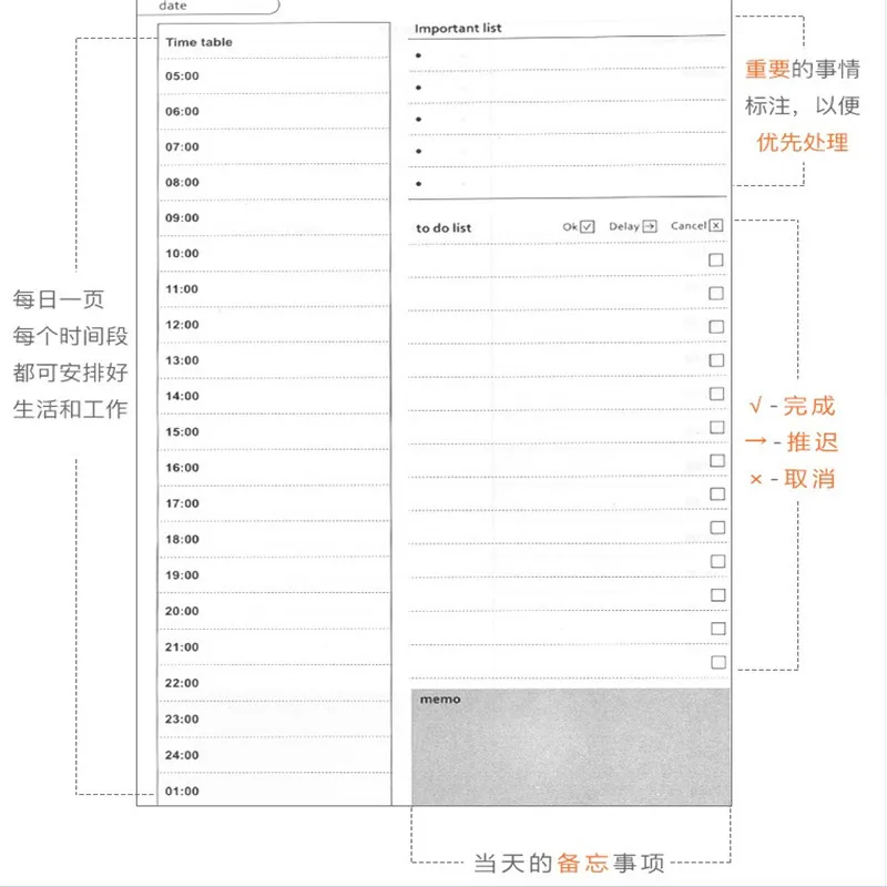100% новый и высококачественный Четкий план, разумный контроль вашего времени Материал: бумага Размер (Д * Ш): около 13 см * 19 см Общее количество: 96 страниц