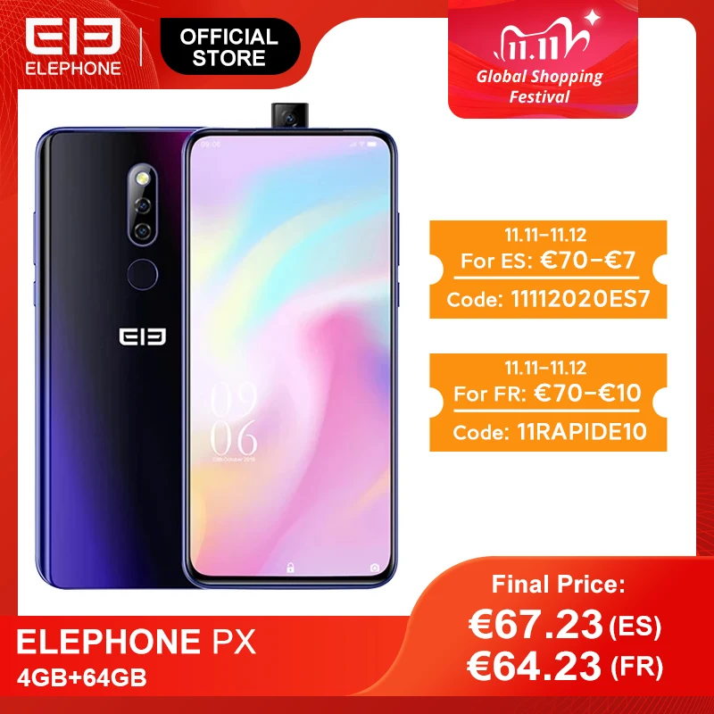 ELEPHONE PX Helio смартфон с восьмиядерным процессором MT6763, ОЗУ 4 Гб, ПЗУ 64 ГБ, 16 Мп, 6,53 ''FHD +, 3300 мАч, Android 9,0 7000 - 800 КодHOCHU 11.11 10:00 a.m