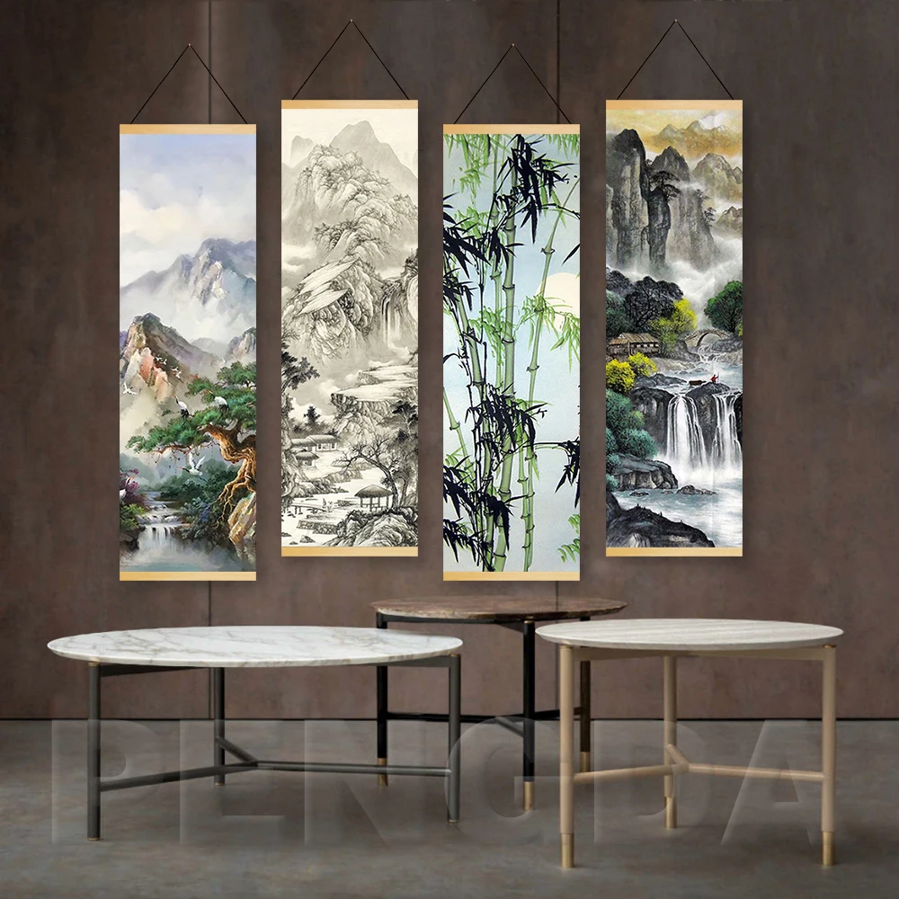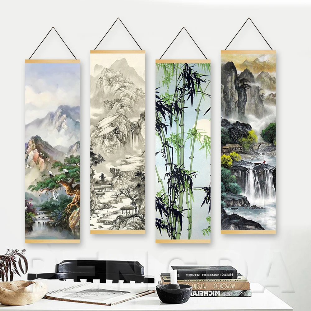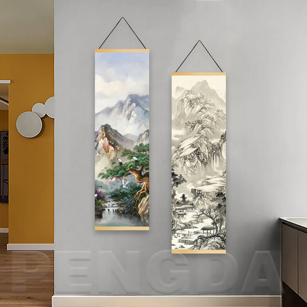 Постер с принтом, скандинавский рисунок на холсте, деревянный свиток, картина с китайским пейзажем, рисунок с водой чернилами для подарка, настенный Декор для дома