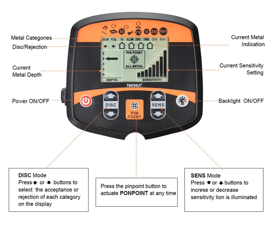 5. Легенда идентификатора цели на ЖК-экране-работает совместно с курсором идентификатора цели, указывая вероятную идентификацию цели. Возможно, материал показан словами и изображениями: железо, фольга, 5 процентов, квасцы, цинк, 10 центов, 25 центов, 50 центов +, затем, чтобы помочь пользователю сослаться и решить, следует ли копать сгоревшую цель самостоятельно.