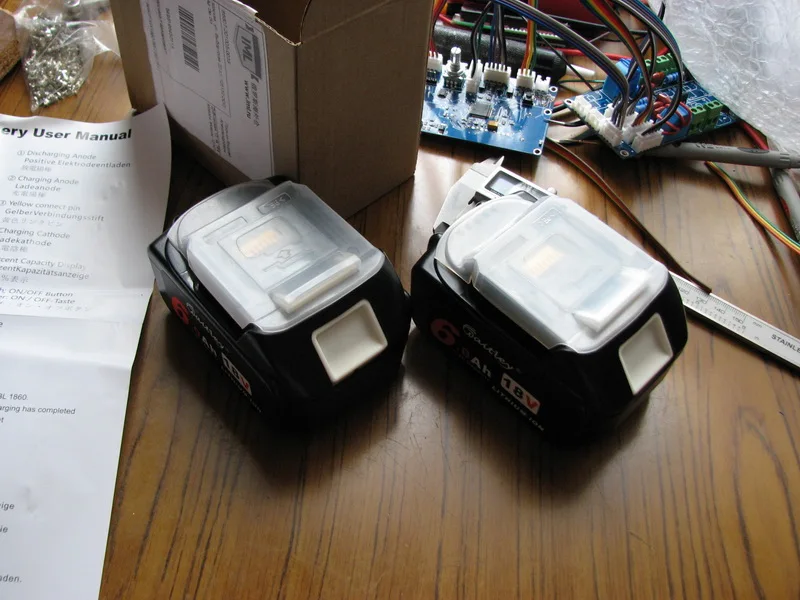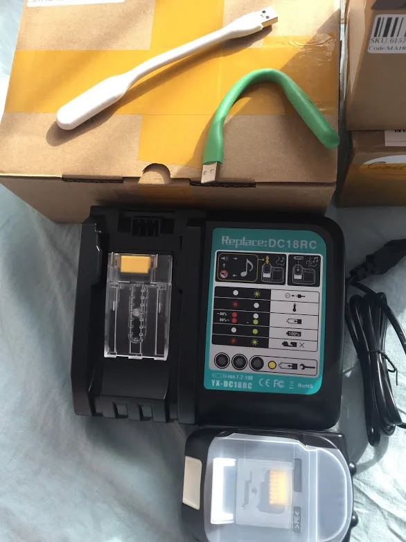 пришли 4 аккумулятора 6а/ч , заряженные на 64 процента. Вставил в стандартный макитовский зарядник и дозарядил до 100процентов. Продавец положил в каждый аккумулятор по одному светодиодному USB фонарику в подарок.