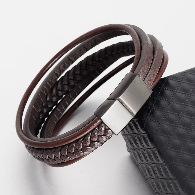Модный браслет из натуральной кожи, Мужская многослойная плетеная веревка, браслет из нержавеющей стали с магнитной застежкой, мужские браслеты, мужские ювелирные изделия