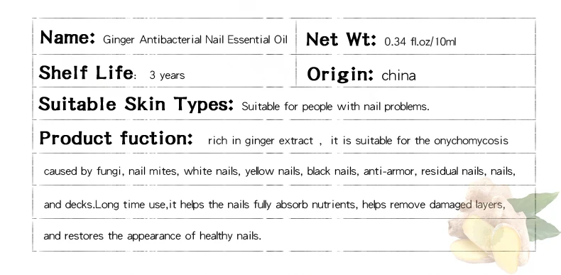 Этот продукт богат экстрактом имбиря, он подходит для онихомикоза, вызванного грибками, клещами для ногтей, белыми ногтями, желтыми ногтями, черными ногтями, антиброневыми, остаточными ногтями, ногтями, И палубы. Длительное использование, помогает ногтям полностью впитывать питательные вещества, помогает удалить поврежденные слои и восстанавливает внешний вид здоровых ногтей.