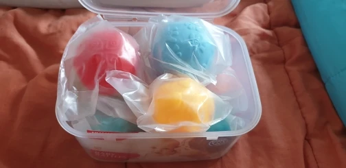 Материал игрушек мягкий, приятный на ощупь, при нажатии игрушка немного свистит. При получении был запах, но он смылся после большого количества мытья. Ребенку очень нравиться перебирать их ручками, так как они разной формы и цвета.
