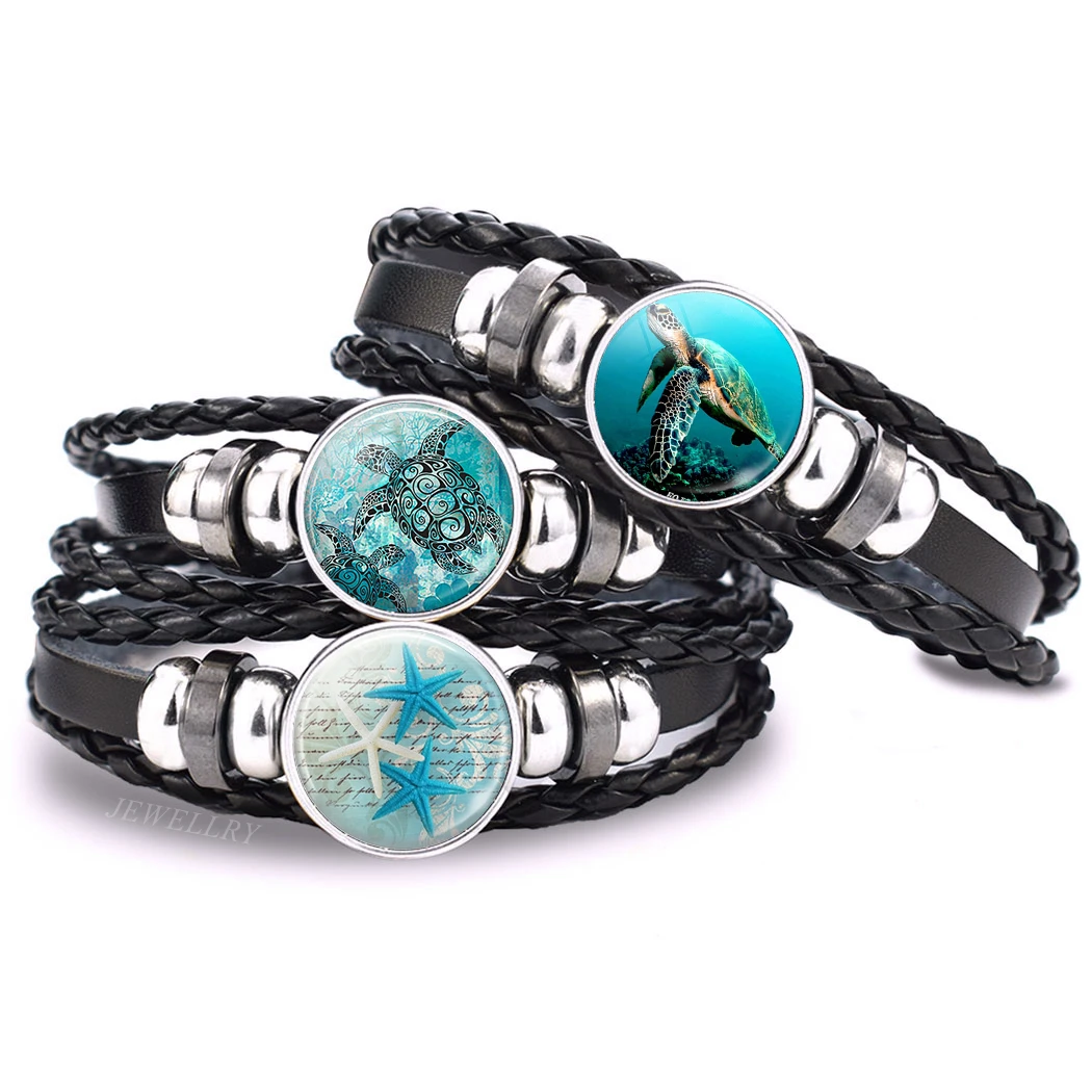 Морская черепаха дельфин браслет из морских раковин стеклянный кабошон ручной работы ювелирные изделия Винтаж океан сувенир черный крутой панк браслеты мужской подарок