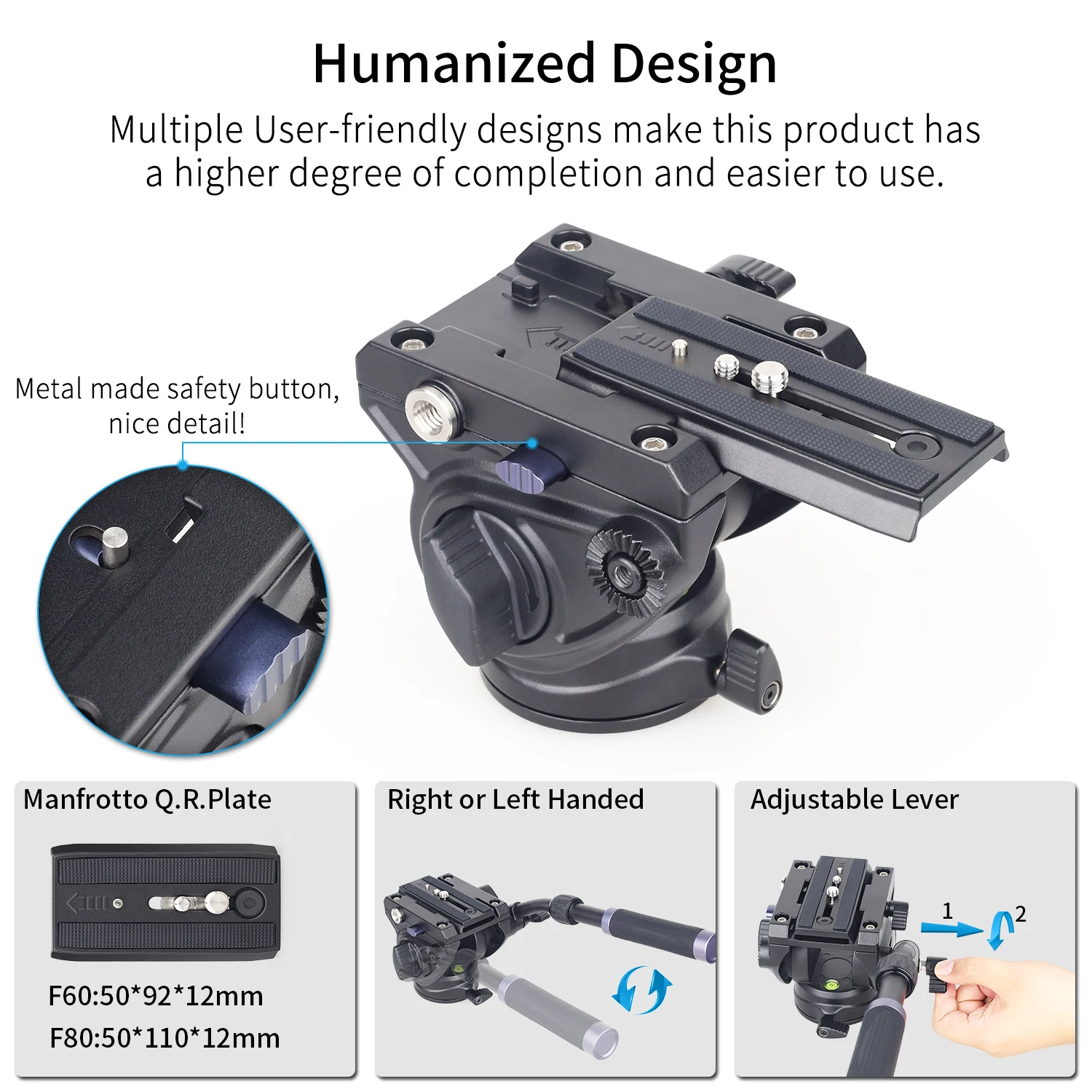 【Превосходное качество 】эта видео головка изготовлена из высококачественного алюминиевого сплава, изготовленная по прецизионным технологиям ЧПУ и литья, делает ее лучшим качеством в своем классе【Широкий диапазон движения 】 Эта головка для видеосъемки подходит для видеосъемки, так как ее широкий диапазон движения и плавное Демпфирование【Грузоподъемность 】максимальная нагрузка этой видеокамеры составляет 10 кг/12 кг, она идеально совместима с большинством крупных профессиональных штативов и моноподов, большинством больших камер и объективов【 2-х секционный Регулируемый Handle】This видеоголовкой для ручки принимает 2-х секционный структура, длина может быть отрегулировано между 27 см 41 см, подходит для большего количества требования【Humanized детальный дизайн 】многократное использование r-friendly дизайн делает эту видео головку более высокой степенью завершения и проще в использовании【Универсальная пластина Q.R. Это универсальная БЫСТРОРАЗЪЕМНАЯ пластина, эта головка видео совместима с быстроразъемной пластиной серии Manfrotto 501PL, и очень удобно снимать быстроразъемную пластину