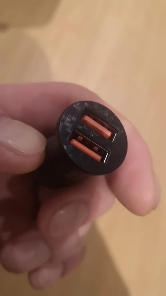 Корпус весь в мелких царапинах и остатках клея как от скотча. Подсветка гнёзд так себе. Но быстрая зарядка в данном устройстве присутствует! Зарядка выдавала 9,4 В при быстрой зарядке и ток 1,79 А. На проблемы царапин забили, не та стоимость изделия, да и в прикуривателе их видно не будет. Доставка в Украину мега быстрая. Рекомендую.