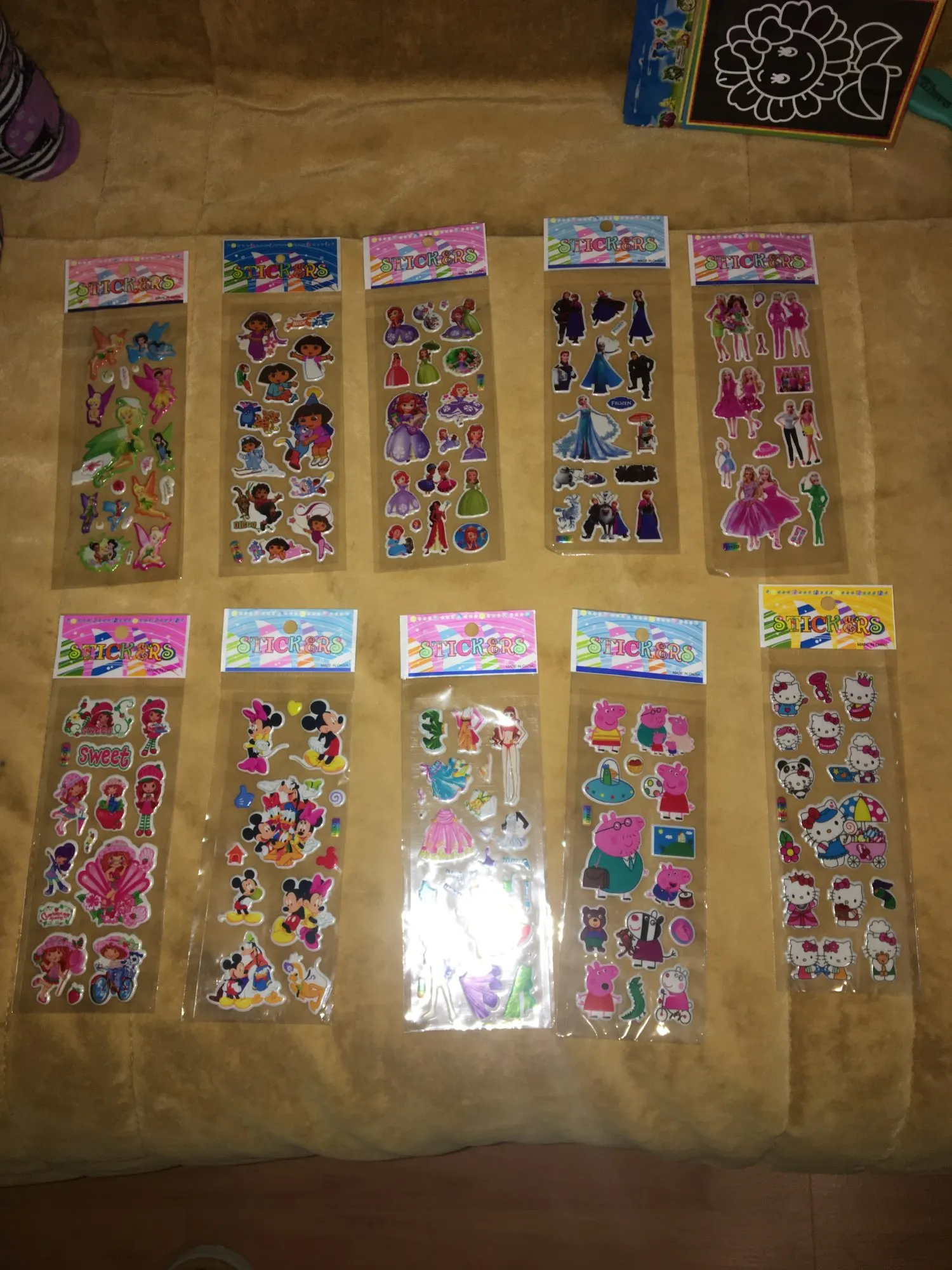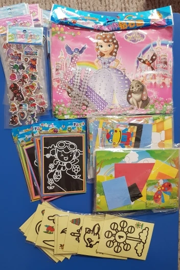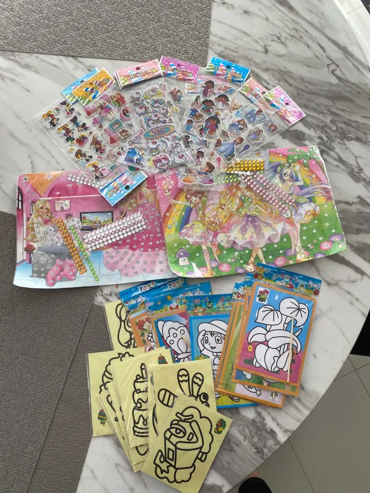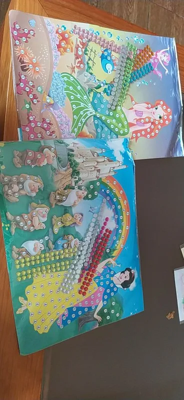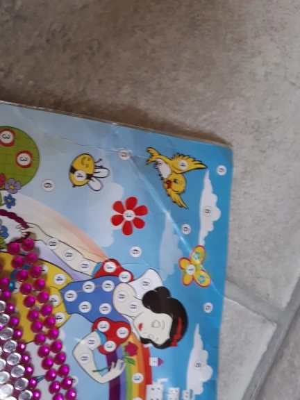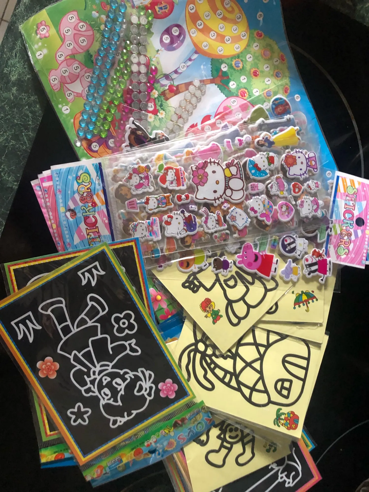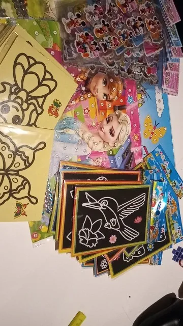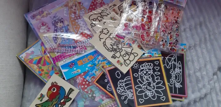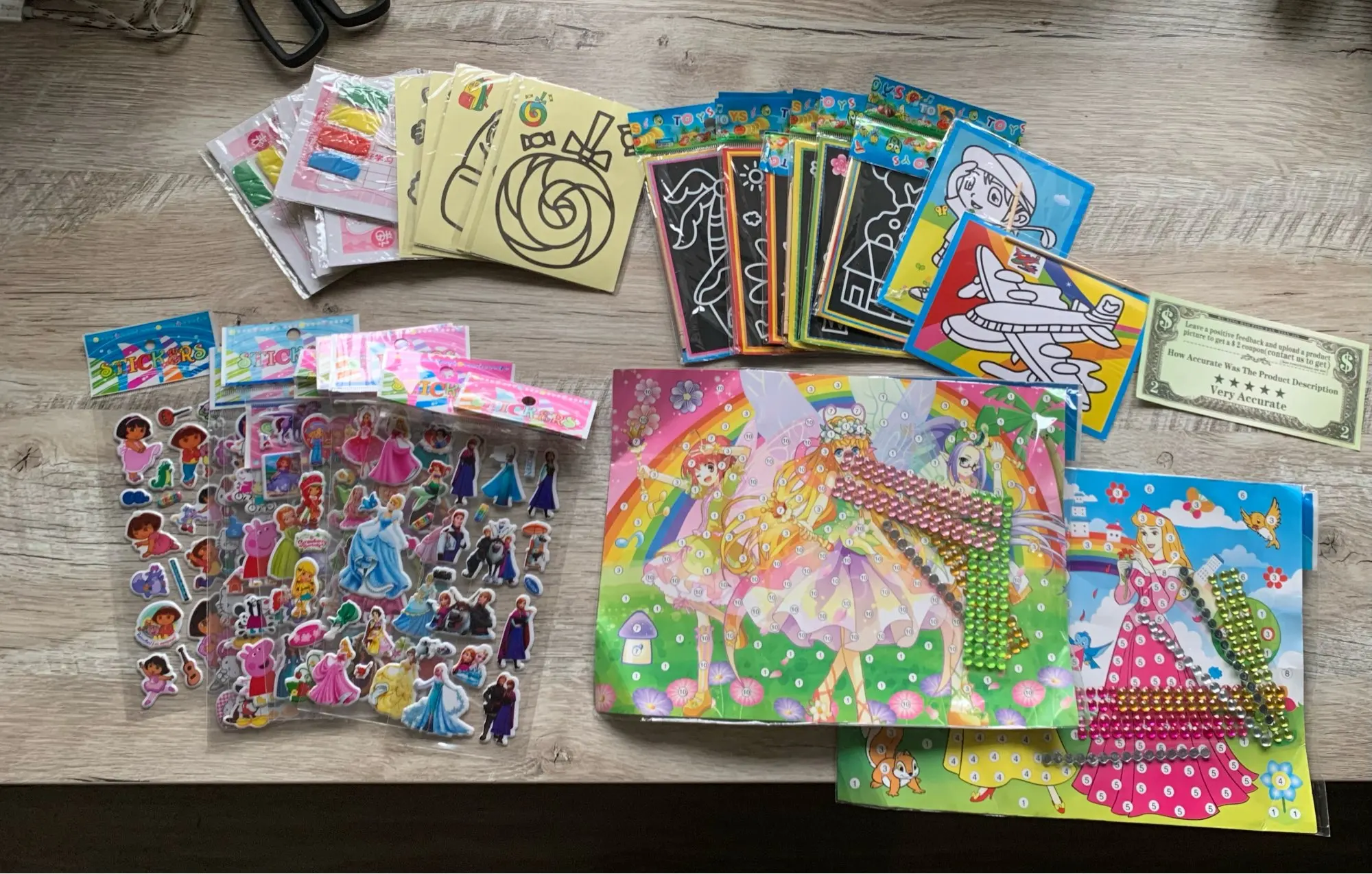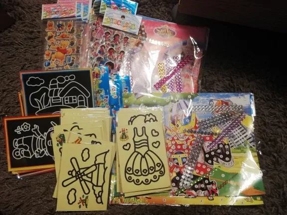 Товар прибыл быстро. Черные царапины имеют небольшой размер. Включает в себя только 2 рисунка для украшения блестящими ювелирными изделиями. Очень разнообразные наклейки: Микки Маус, Принцессы Диснея, Хелло Китти.