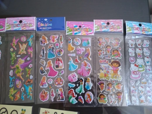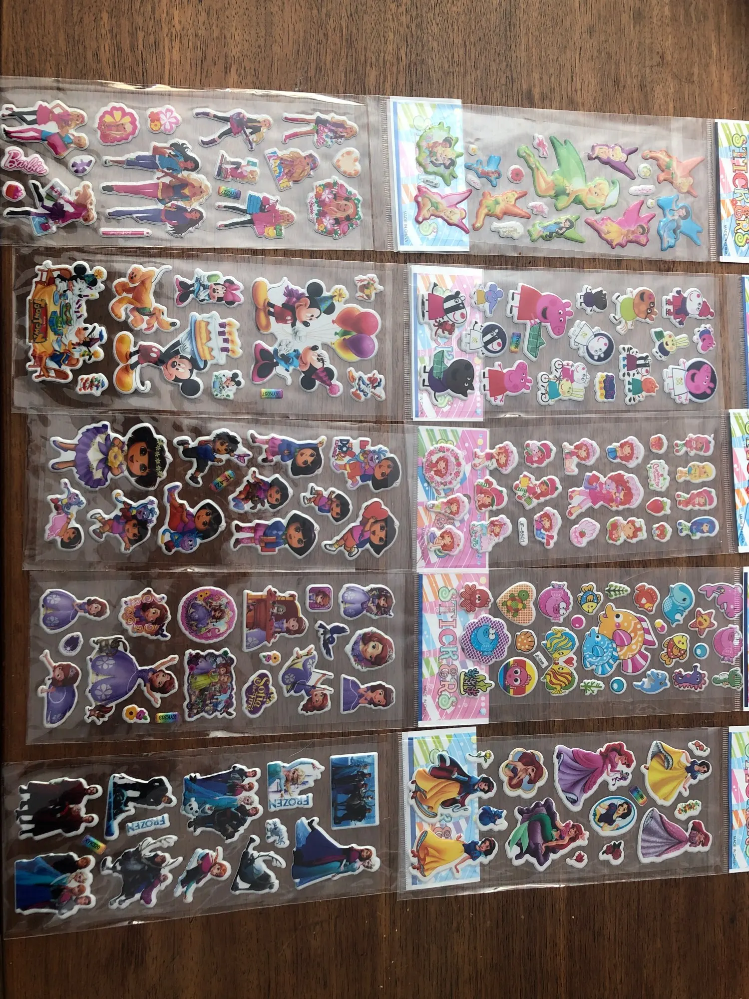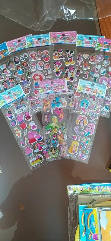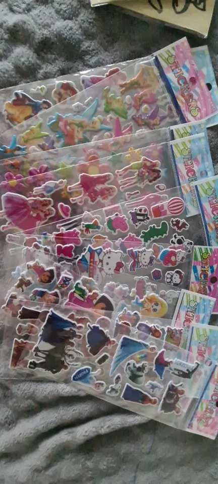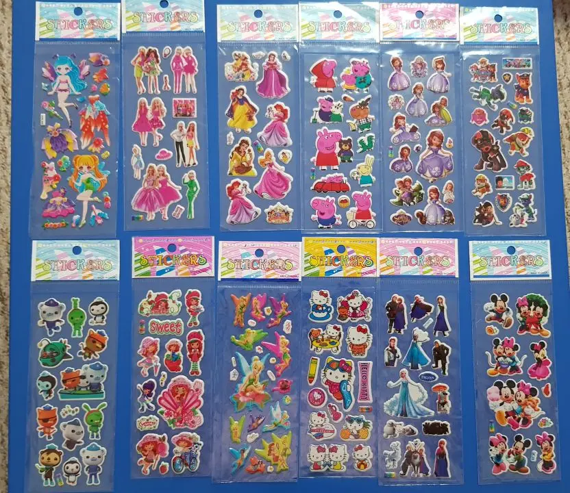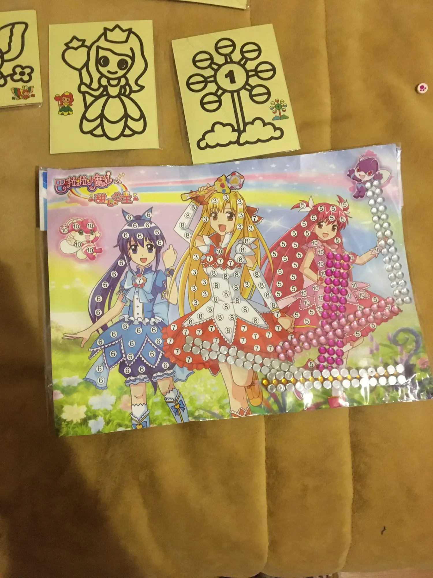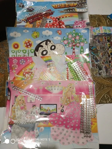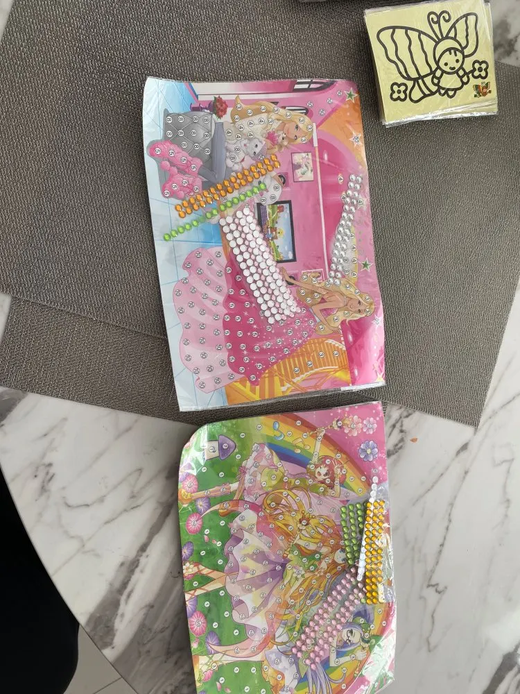 Товар прибыл быстро. Черные царапины имеют небольшой размер. Включает в себя только 2 рисунка для украшения блестящими ювелирными изделиями. Очень разнообразные наклейки: Микки Маус, Принцессы Диснея, Хелло Китти.
