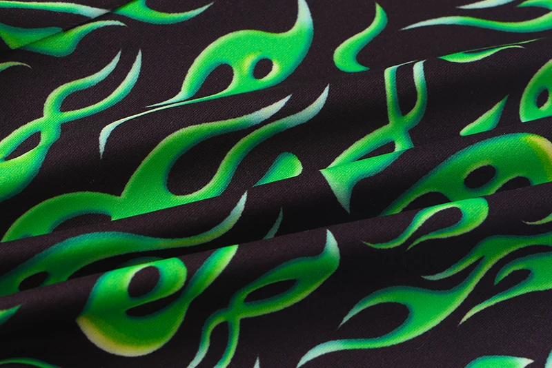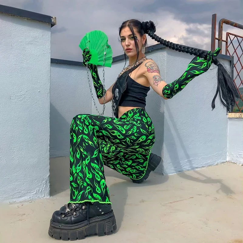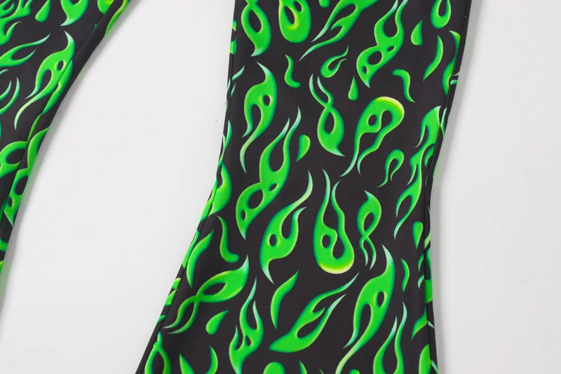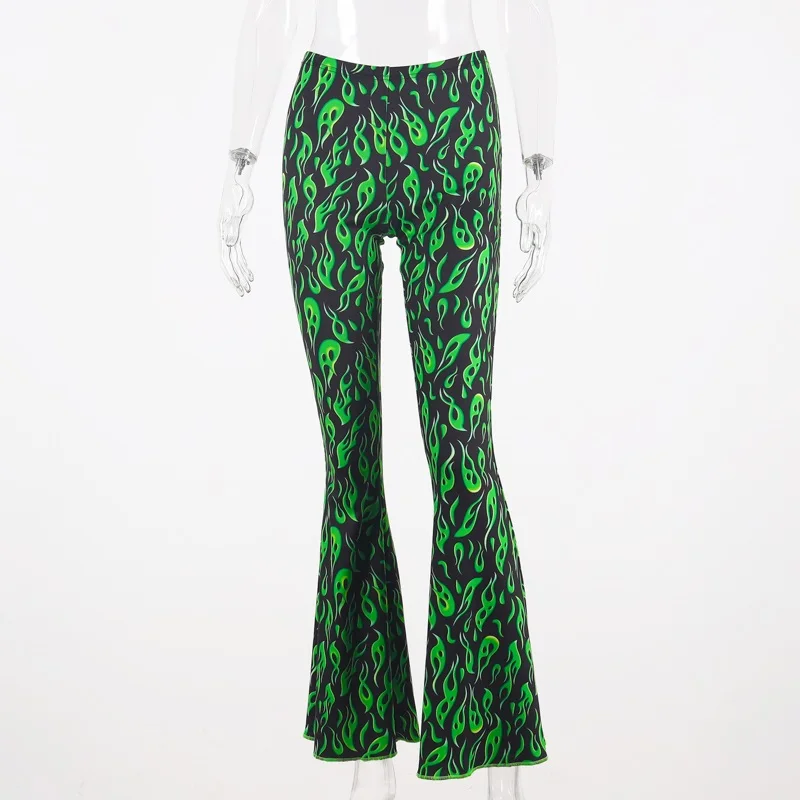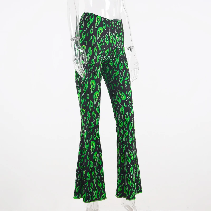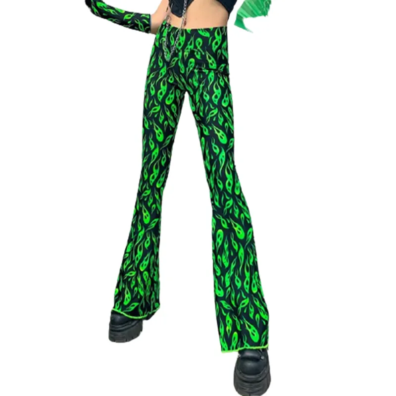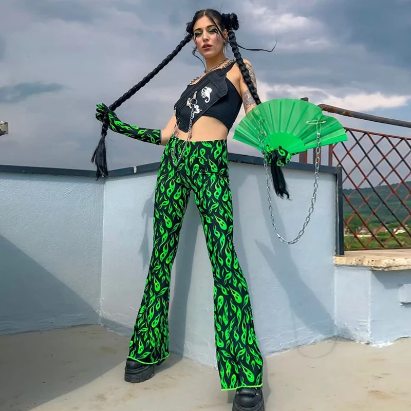 Брюки клеш с высокой талией, пикантная уличная одежда зеленого цвета с принтом огня, брюки-клеш в стиле панк, на лето