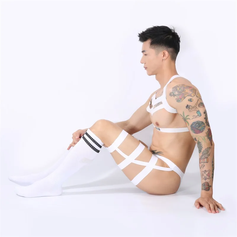 Нижнее белье для мужчин, сексуальные ремни на лямках, пояс для ног, трусы, длинные носки, Бандажное белье, эластичный эротический костюм, комплект, фетиш, мужские чулки