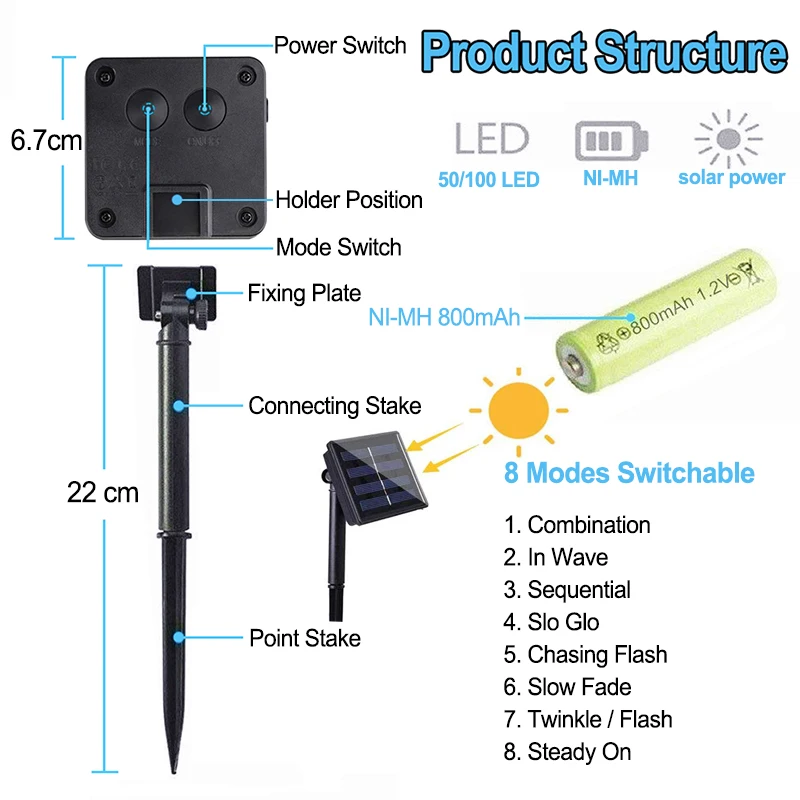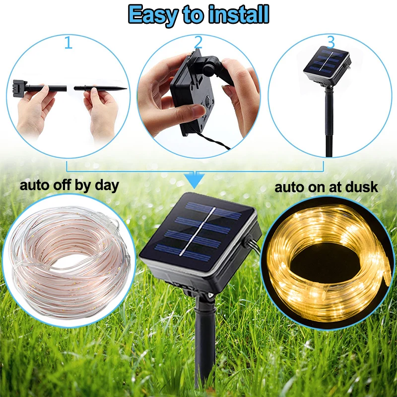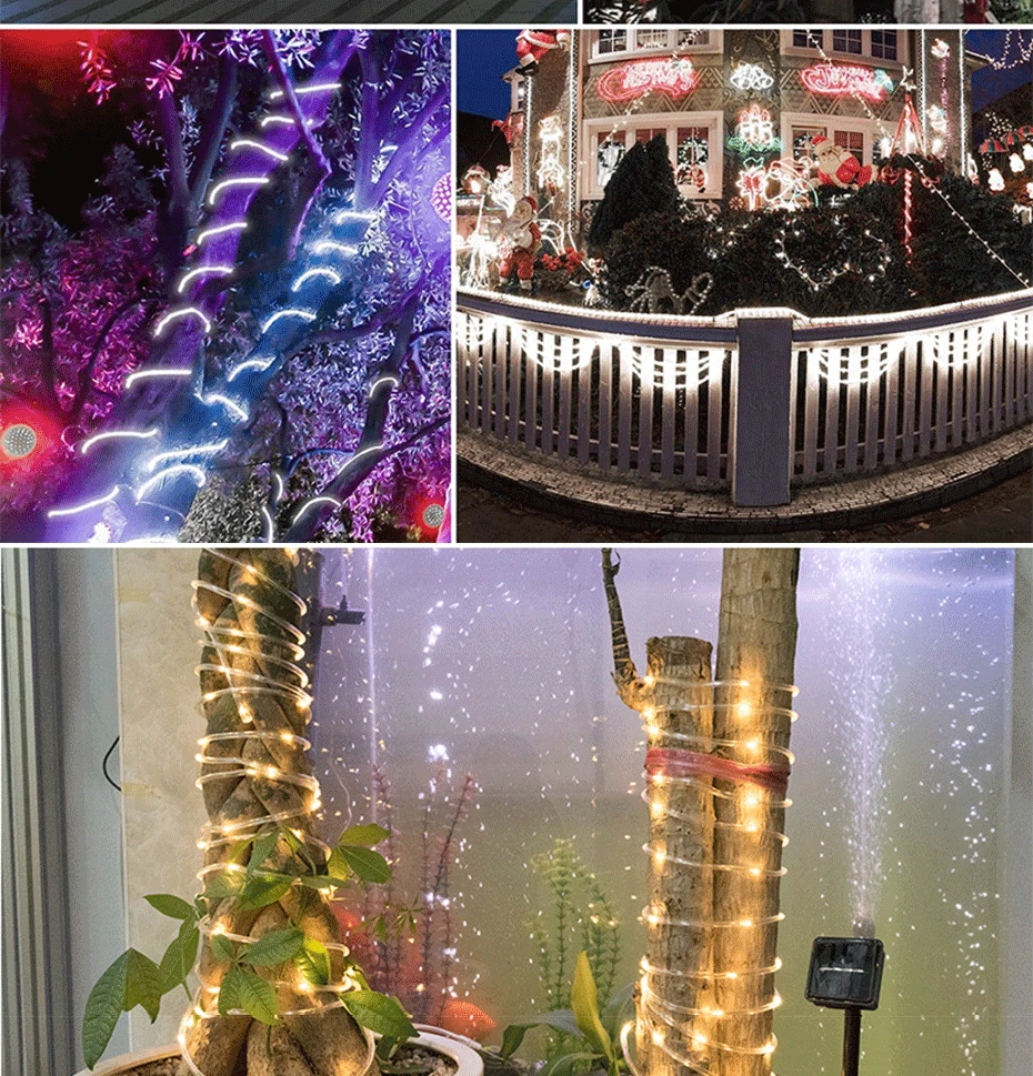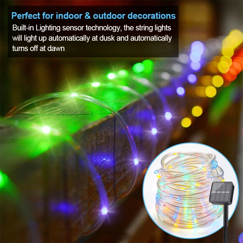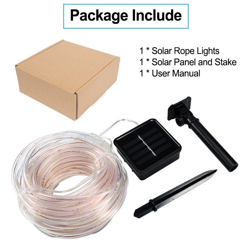 Характеристики продукта:1. Гибкая крышка трубки из ПВХ. Эти наружные солнечные светильники с медной проволокой 7 м, 12 м, 22 м,Который полностью покрыт прозрачными трубками из ПВХ,Трубка светлячков прочная и гибкая,Но достаточно тонкая, чтобы обернуть любой способ, чтобы создать светящийся персонаж в качестве снеговика или супергероя или уникальных слов,Добавьте больше удовольствия вашим мероприятиям на открытом воздухе или в помещении. Светящиеся светодиоды 50/100/200 с постоянным углом обзора 360 градусов освещают в любом направлении. Просто разжигайте свое воображение!2. Высокая емкость аккумулятора и водонепроницаемость ip65. Разработан с регулируемой солнечной панелью и перезаряжаемой батареей,Наши солнечные гирлянды могут работать непрерывно более 12 часов ночью, если панель поглощает достаточно солнечного света в течение дня. Трубка предназначена для выдерживания светильник кого дождя или проливов воды. Отлично подходит Вечерние,Свадьба,Дом,Окно,Ванная,Показывает,Ресторан,Отель,Двор,Сад,Патио,Рождественская елка, коммерческое здание,Торговый центр и т. Д.3. Высококачественная Солнечная гирлянда. Наши световой шнур на солнечной батарее с 50/100/200 шт светодиодные лампы с низким тепловыделением,До 19% высокий коэффициент конверсии энергии по сравнению с другими 13%. Они защищают окружающую среду и не истощают энергии;Прочный и безопасный в использовании,Светодиоды не будут перегреваться после использования в течение многих часов,Вы можете видеть светлячки в вашем саду в любое время,Сделайте свой двор очаровательным. Сверхгибкая проволока легко сгибается и формируется вокруг растений,Знаки,Мебель и почти все остальное.4,8 режимов освещения для получения удовольствия. Великолепные 8 режимов освещения, включая комбинацию,Светлячки мигающие,Волны,Выцветание,Погоня/мигание,Медленно выцветает,Мерцание/мигание и постоянное включение,Что может создать разную атмосферу для вашей жизни. Гибкие провода могут легко создать нужные вам формы;Оберните вокруг стволов деревьев или беседок;В темноте,Провод исчезает до невидимости,Оставляет только яркий свет. Эти декоративные веревочные гирлянды на солнечных батареях сделают ваш дом и сад очаровательными и романтичными. Почему выбирают нас?8 режимов мигания для создания различной атмосферы в вашей жизниНажмите Вкл/Выкл,Он будет мигать из режима 2 в режим 7 наугадНажмите «режим», чтобы выбрать определенный режим: мигание светлячков;Машущий;Выцветание;Погоня/мигание;Медленно выцветает;Мерцание/мигание;Устойчивый;Выкл Сделайте свой дом другимВеревочные светильники на солнечных батареях-это именно то, что вам нужно, чтобы ваш дом привлек внимание поклонников этого праздничного сезона.Будь то праздничное или романтическое настроение,Или просто чтобы принести веселое ощущение в ваш дом,Эти уличные гирлянды-лучший выбор для вас. Характеристики:Количество СВЕТОДИОДНЫЙ Дов: 50/100/200 шт.Общая длина: 5 м, 10 м, 20 мДлина провода до светодиодный да: 2 мРасстояние между светодиодами: 10 смСолнечная панель: 2 в 170 мА. Фотоэлектрическая эффективность преобразования 17%Аккумулятор: встроенный никель-металлогидридный аккумулятор AA 600 мАчВремя зарядки: 6-8 часовВремя работы: 8-10 часов Посылка входит1 x шип 20 см1 х Солнечная гирлянда с блоком солнечной панели1 х Руководство пользователя