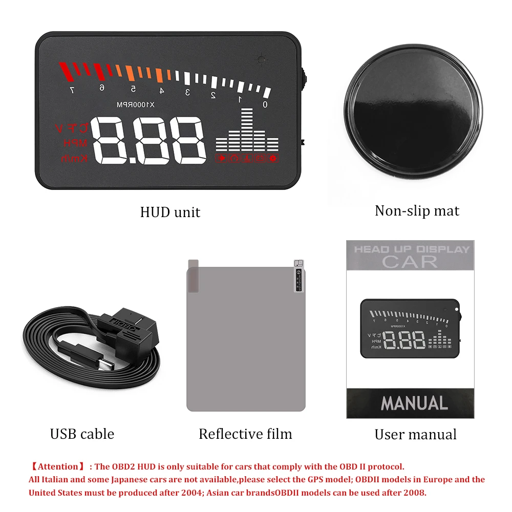 Посылка:1 x X5 Head Up Display1 кабель OBDСветоотражающая пленка-1 шт.1 противоскользящая накладка1 x Руководство пользователя