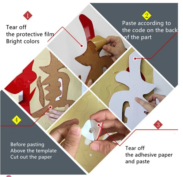 1. Проверьте детали2. Прикрепите шаблон к стене3. Номер детали соответствует номеру шаблона для вставки4. Все детали полностью наклеены5. Удалите шаблон бумаги6. Снимите защитную бумагу