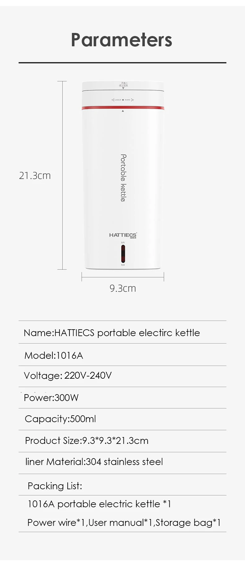 Название: Портативный электрический чайник HATTIECSМодель: 1016A Электрический чайникОтмеченное напряжение: 220 В, 50 ГцМощность: 300 ВтЕмкость: 500 млРазмер продукта: 9,3*9,3*21,3 смМатериал подкладки: нержавеющая сталь 304Подходит для: дома, офиса, отеля, путешествий, деловых поездок, студенческого общежития...