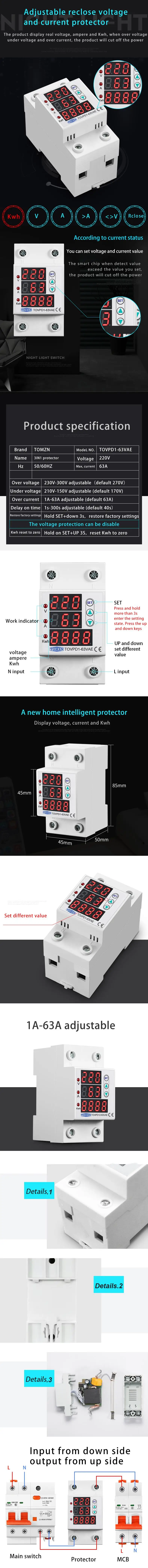Реле повышенного и пониженного напряжения 230 А, защитное устройство предохранитель в, дисплей 3 в 1, Din-рейка, с защитой от сверхтока