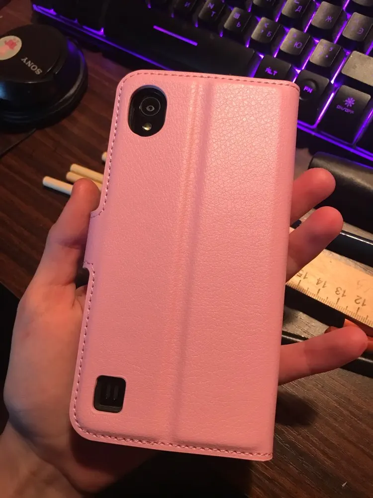 достаточно тонкий чехол-книжка с силиконовым бампером. Удобный доступ к датчику отпечатков (для данного телефона актуально) Довольно дубовый материал - плюс: меньше шансов поцарапать чехол, минус: дубовый, но вроде разнашивается на сгибах.