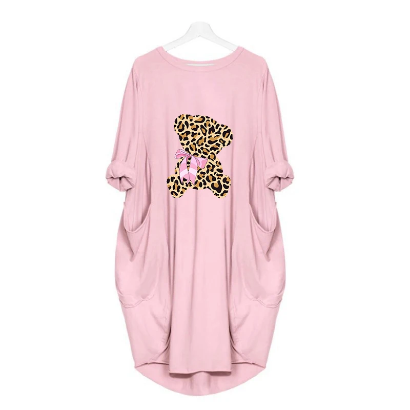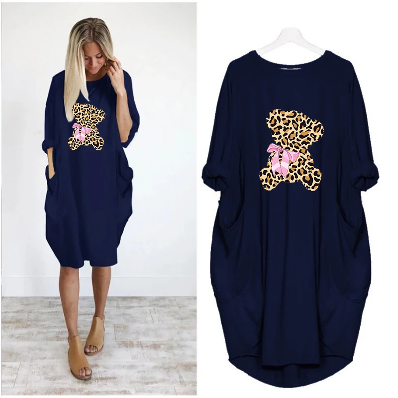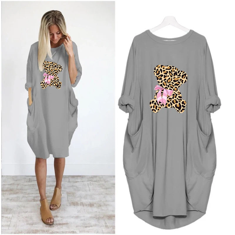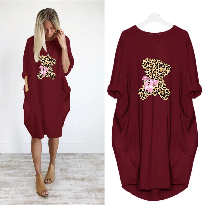Женское леопардовое винтажное вечерние средней длины с карманами и принтом медведя из мультфильма на осень