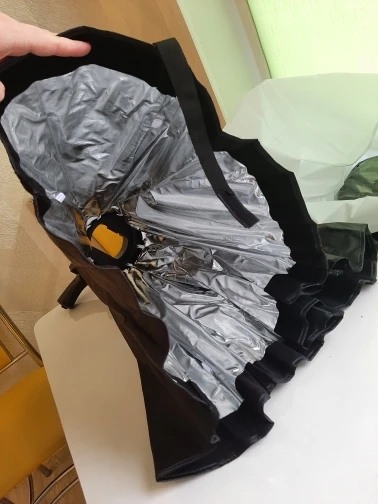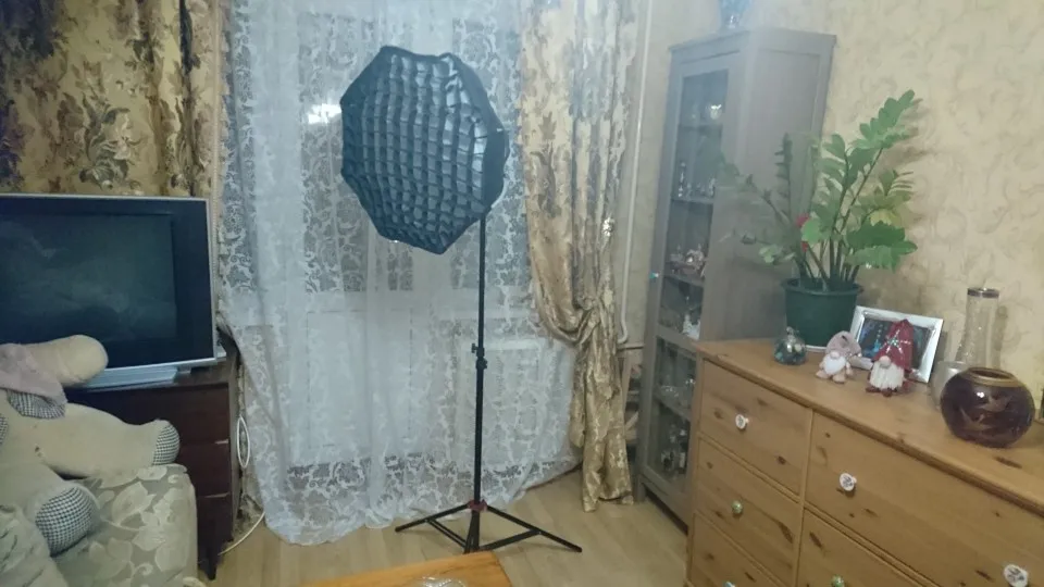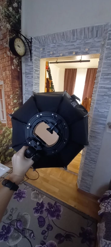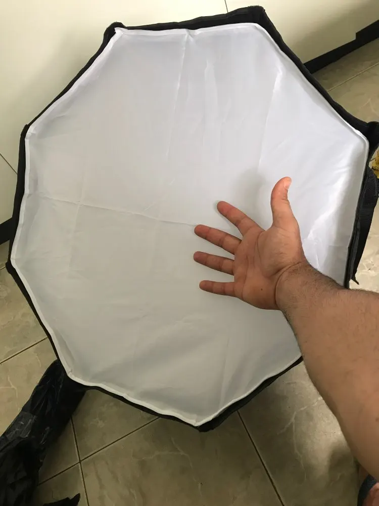 Быстрая доставка, добрался до Москвы за 14 дней, как раз успел до важной съёмки, спасибо! Упакован очень плохо: в тонкую мягкую клеёнку. Удивлён что всё дошло в целости, но другим может повезти меньше. Раскрывается оооочень сложно, нужна физическая сила. Честно говоря боюсь что конструкция с таким тугим креплением вряд ли прослужит долго, но посмотрим. Смело закладывайте перед съёмкой минут 10 на то, чтоб всё раскрыть и закрепить. Две белые тканевые прослойки: внутренняя и внешняя, крепятся на липучки. Можно держать за ручку в руках, но есть также снизу дырка для установки на стойку. Пока доволен, посмотрим сколько прослужит.