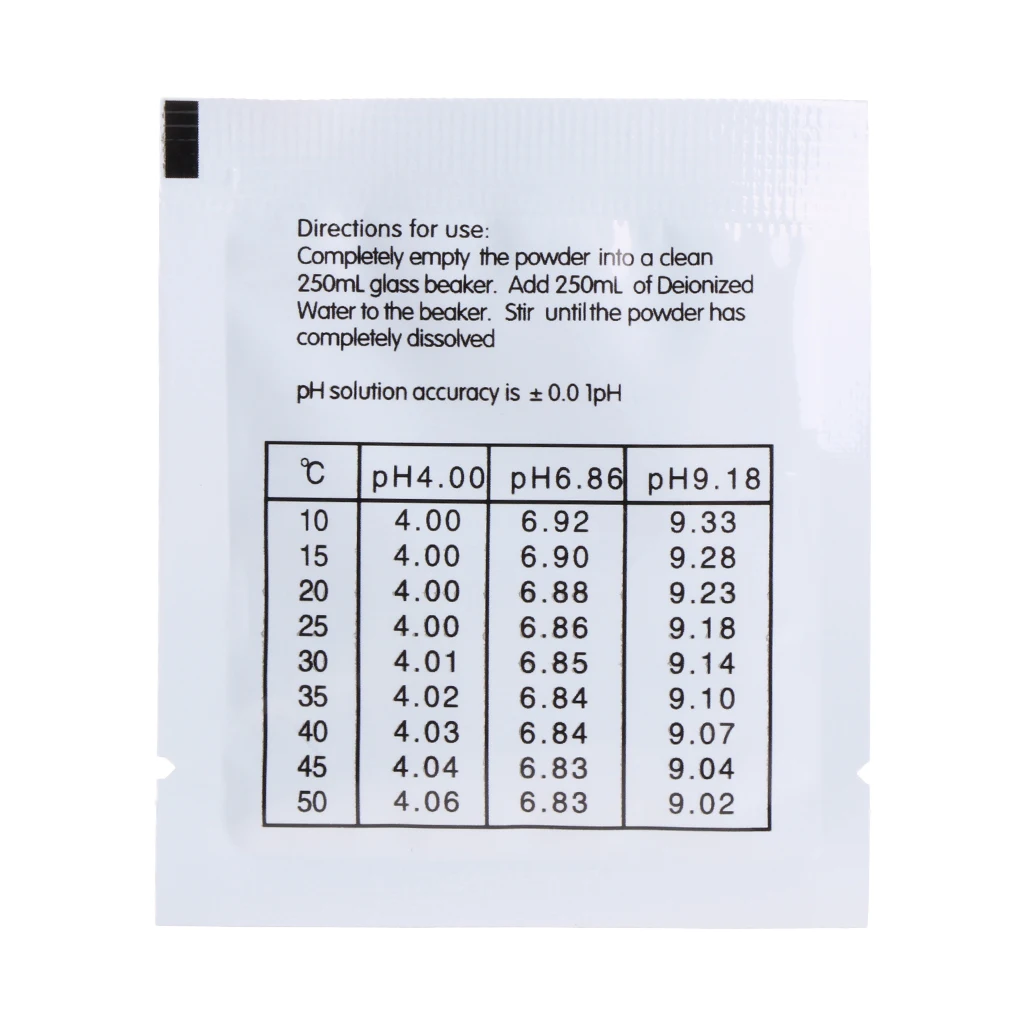 Особенности:20 упаковок популярных буферных растворов pH, 10 упаковок pH4.01 и 10 упаковок pH6.86Простой в использовании. Просто добавьте 250 мл в пакет порошкаПорошок имеет бессрочный срок годностиЛегкая 3-ступенчатое процедуры написано на задней части пакета