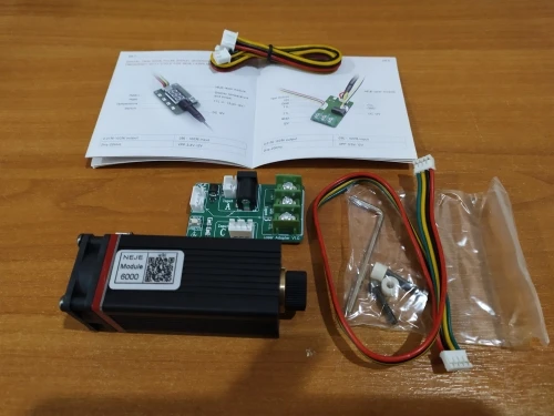 доехало быстро. комплекиация на фото. протестил пока только кнопкой тест на доп плате коммутации. бумажный чек прожгло сразу даже с ненастроеным фокусом. устанавливать в станок чпу буду позже. отзыв дополню как проверю.