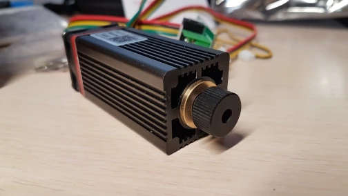 Лазер неплохой. Ток потребления (по 12В) 1,33А. Режет 4 мм фанеру за 4 прохода на скорости 3 мм/сек. Недостаток - плоскость диода стоит параллельно стороне корпуса, а не по диагонали. По этому в одном направлении режет лучше, чем в перпендикулярном.