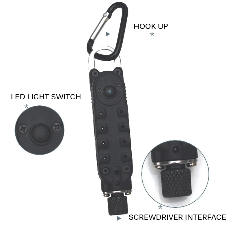Карманная отвертка-брелок на ключи включает в себя все виды инструментов, есть отвертка, плоские и phillips, Шестигранник, гаечный ключ, открывалка для бутылок, светодиодный фонарик с карабином для переноски.
