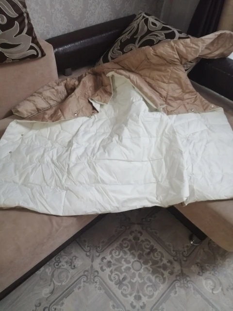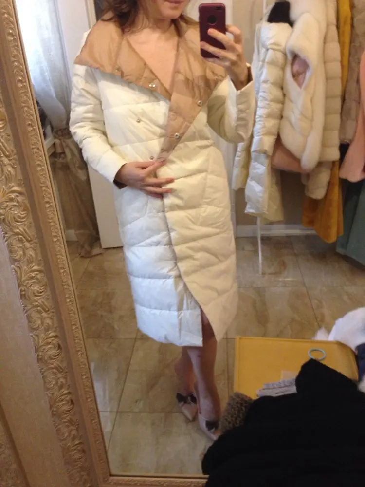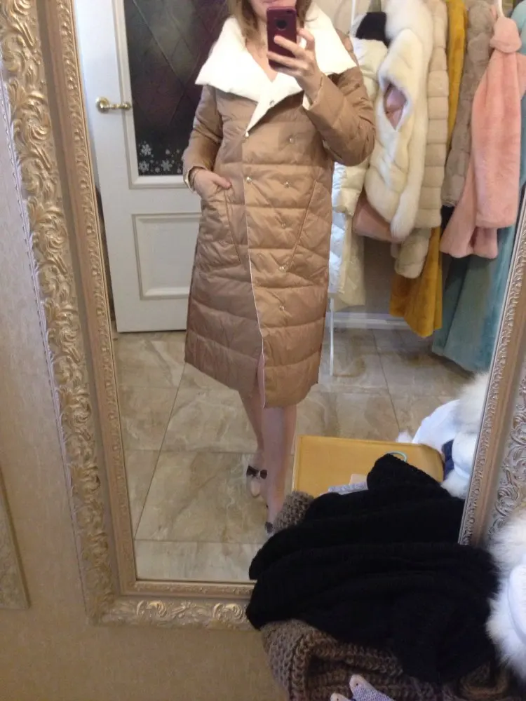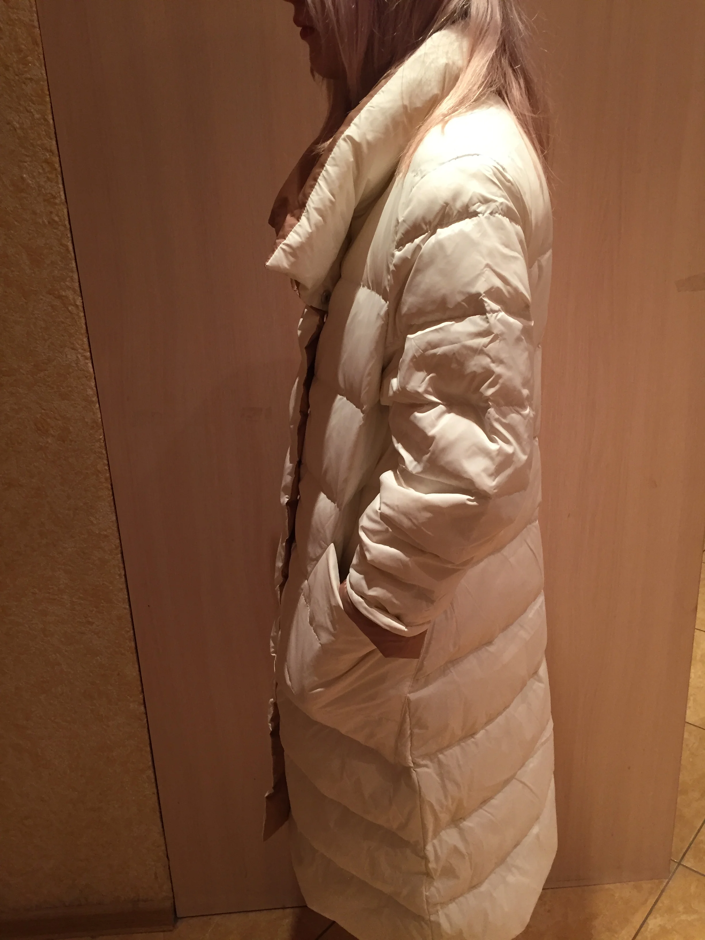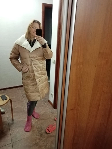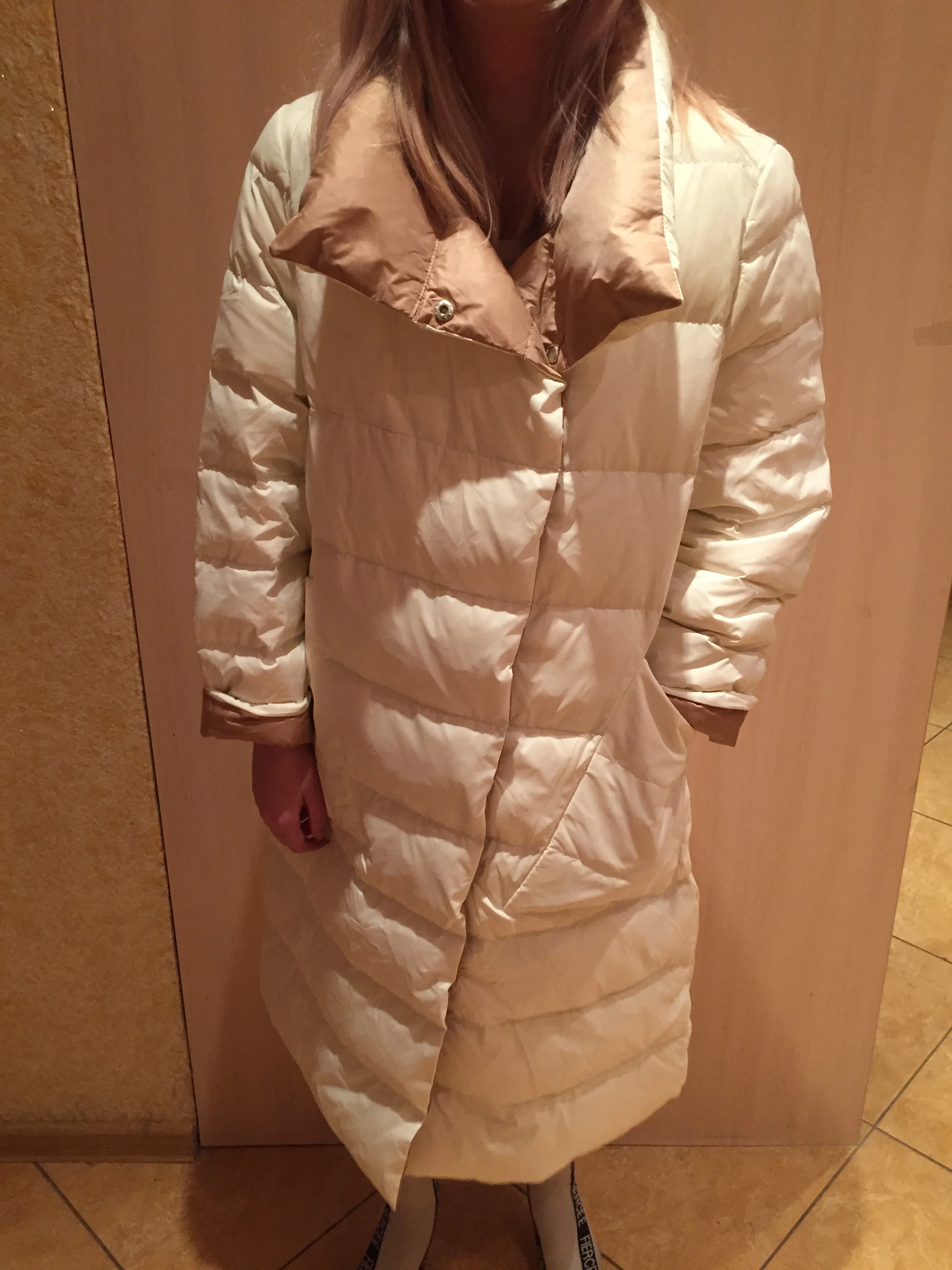 Легкий, аккуратный. Немного рукава коротковаты, но может потому, что с размером ошиблась) думала на свои 94-80-106 влезу в М-ку (там указано, что бюст 98 а талия 106), короче в талии мне свободно, а в бедрах не поместилась))) буду носить расстегнутым или перезаказывать) Нигде нет бирки, что пух или какой размер, может потому, что он двусторонний? Но цвет шикарный молочный, и вторая сторона тоже бежевый с красивым бронзовым отливом