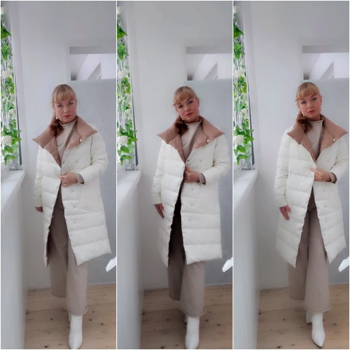 Заказ пришёл быстро, на свой 48рр сел отлично! Куртка конечно совсем не односторонняя))) внутри на бежевой стороне швы наружу. На белой стороне смотрится очень достойно.