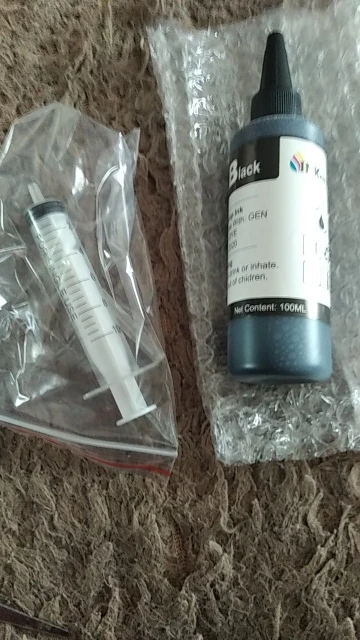 Залил в картридж для хп. Все работает !! Но не совсем чёрные чернила !! Скорее всего темно серые