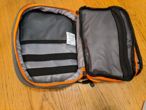хороший органайзер, как раз для мелочевки. Внутри 1 карман на молнии и 4 сетчатых кармана. Снаружи 1 карман на молнии и 1 на липучке.