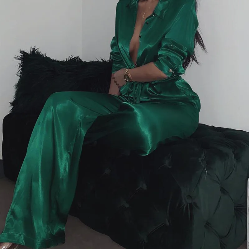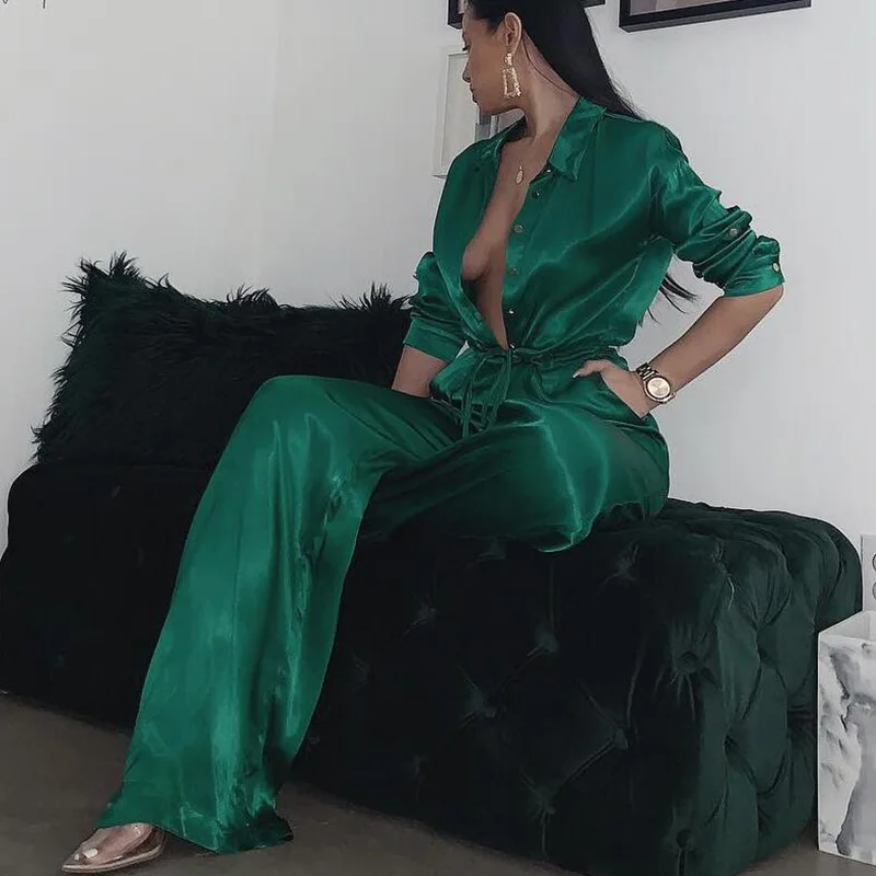Женский атласный комбинезон, элегантные вечерние комбинезоны свободного покроя с отложным воротником и глубоким v-образным вырезом, уличная одежда размера плюс, 2019