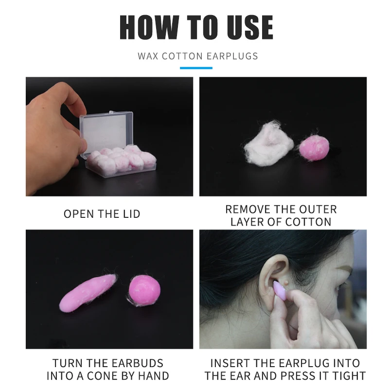 Как использовать: Снимите внешний слой хлопка и обеими руками Зажмите беруши до тех пор, пока они не станут мягкими и коническими, чтобы они соответствовали ушам владельца.