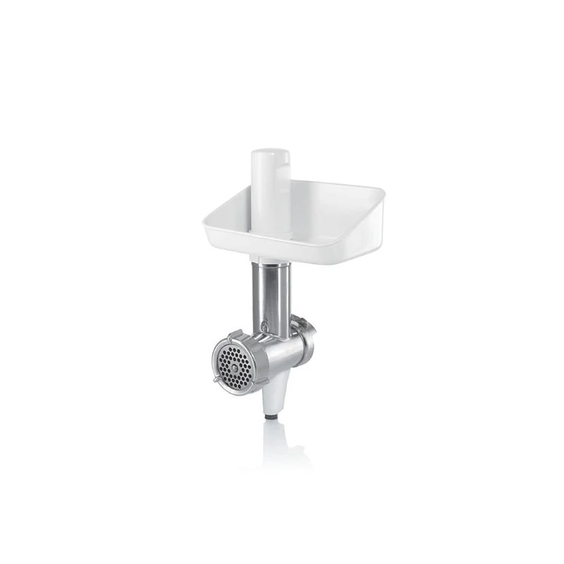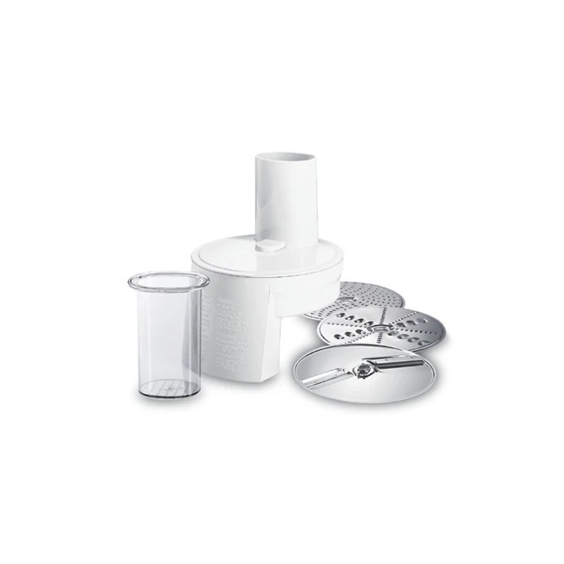 Венчик для замешивания жидкого теста, круглый венчик для взбивания крема и яичных белков, насадка для замешивания крутого теста, универсальная резка с тремя дисками для разных типов нарезки, мясорубка, стеклянный блендер, пресс для цитрусовых и подставка для аксессуаров.