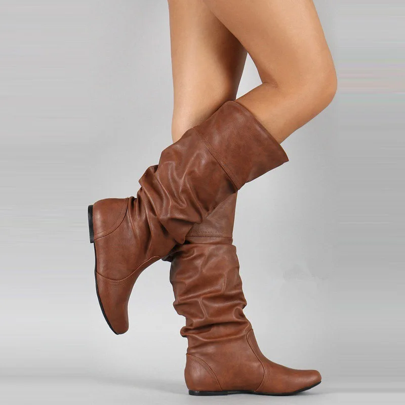 SGESVIERСапоги до середины икры размера плюс 34-52 женские плиссированные Сапоги на каблуке с вставкой женская обувь с круглым носком обувь на плоской подошве осень-зима 2020