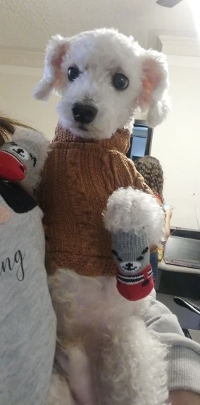 Носочки очень хорошенькие, узенькие, до них покупала такого же размера в зоомагазине - спадывают, а тут хорошо все держит. Брали на Бишон Фризе 5 месяцев