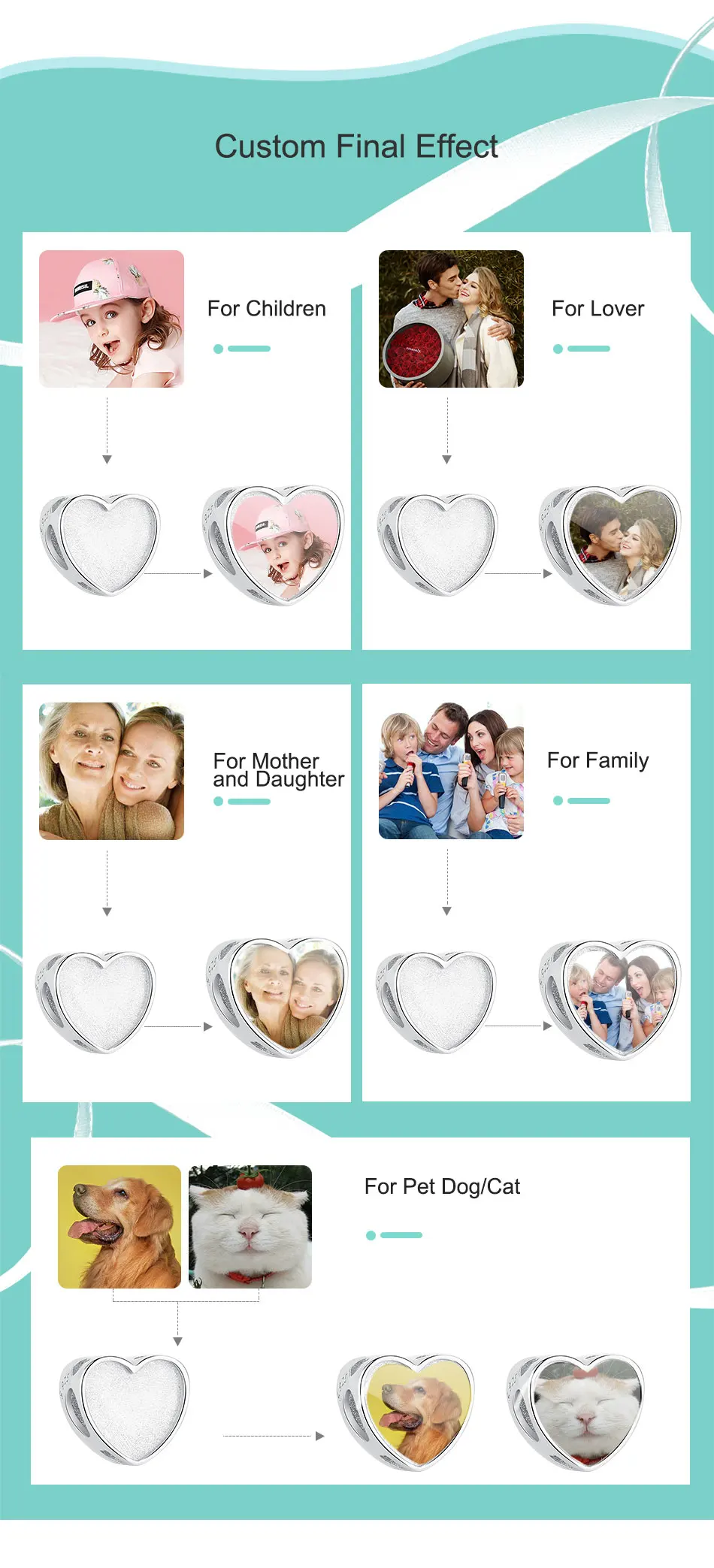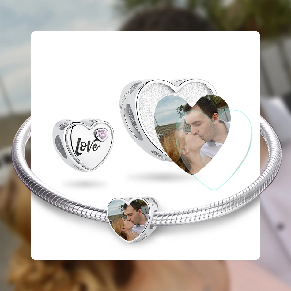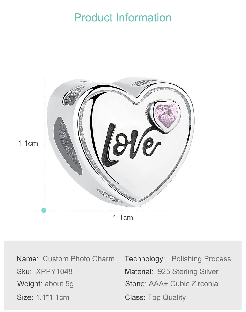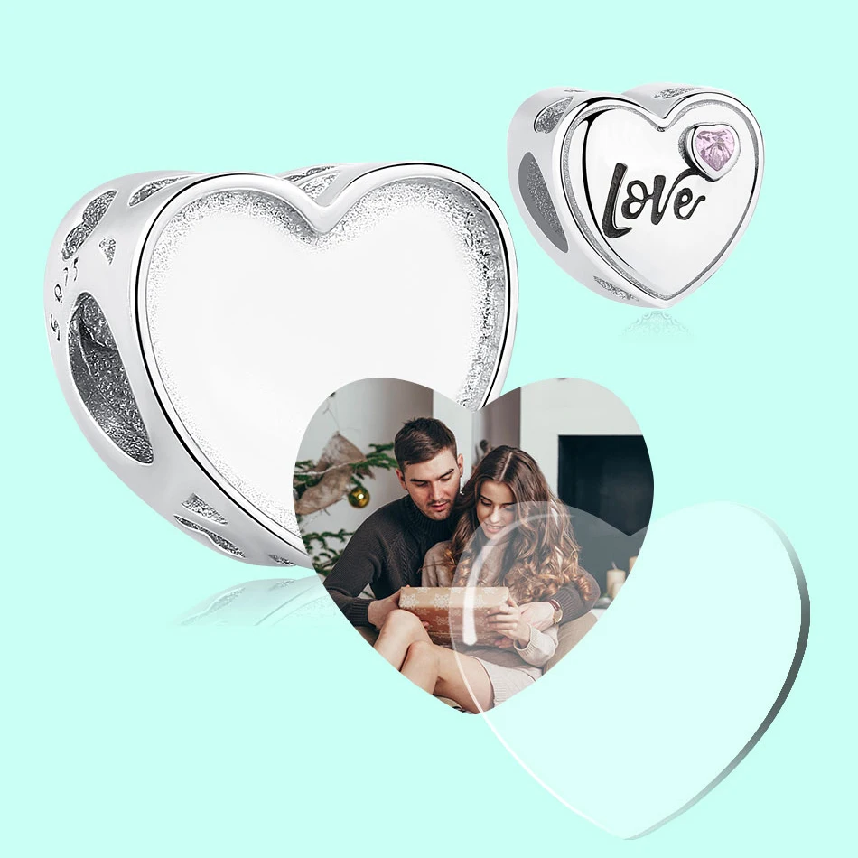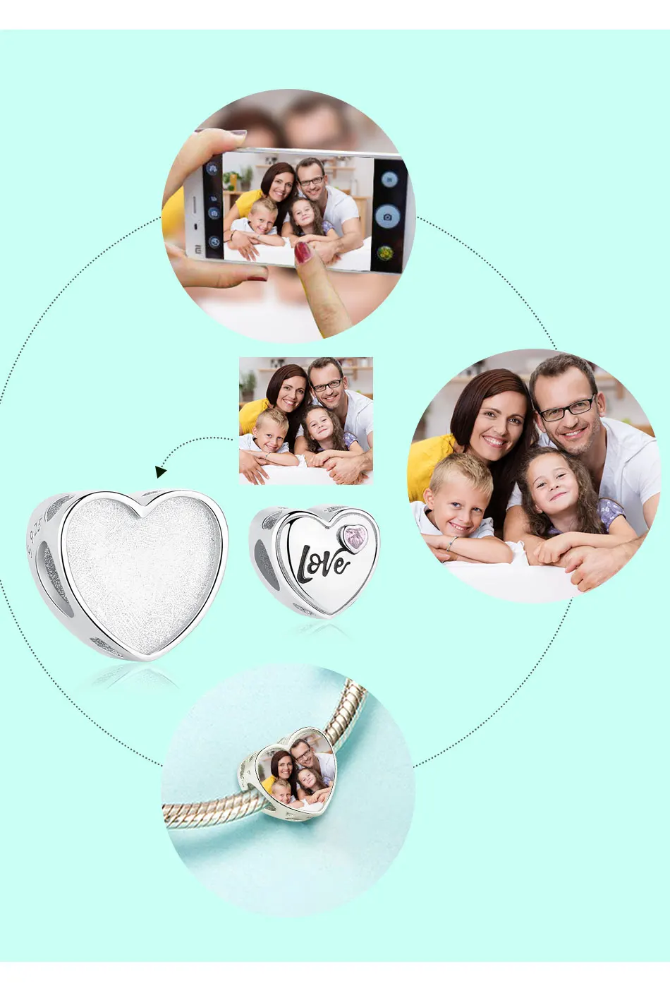Подходит для оригинальных шармов, браслет Forever Love, на заказ, фотошарм из стерлингового серебра 925 пробы, бусины в форме сердца, сделай сам, ювелирное изделие, рождественский подарок